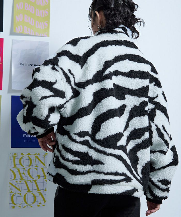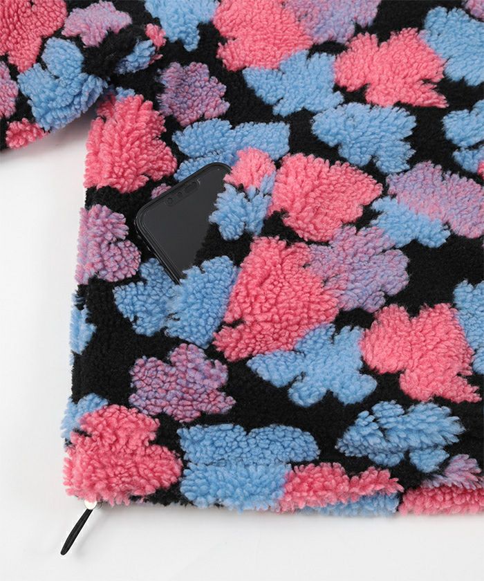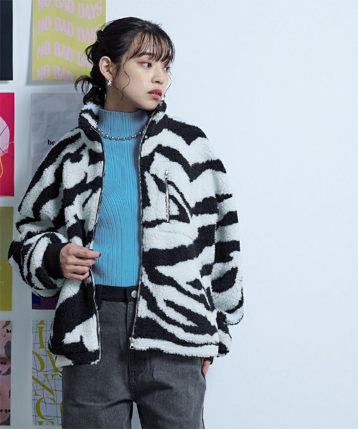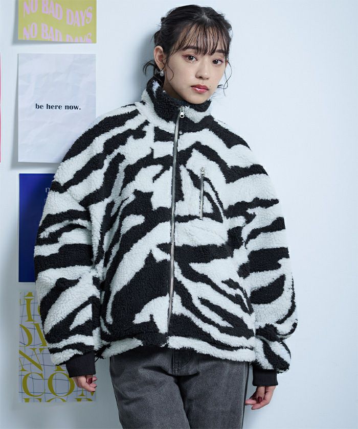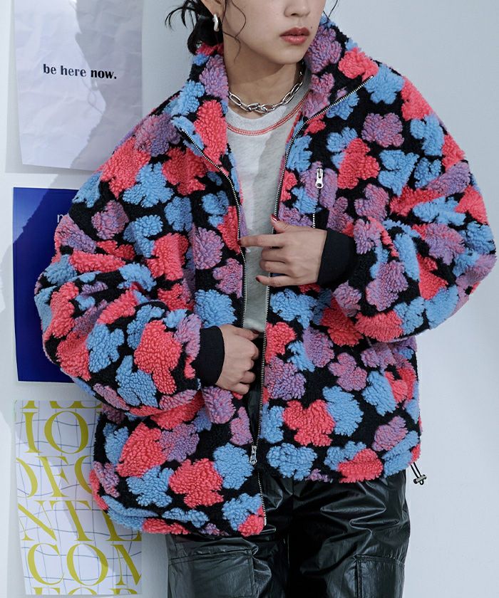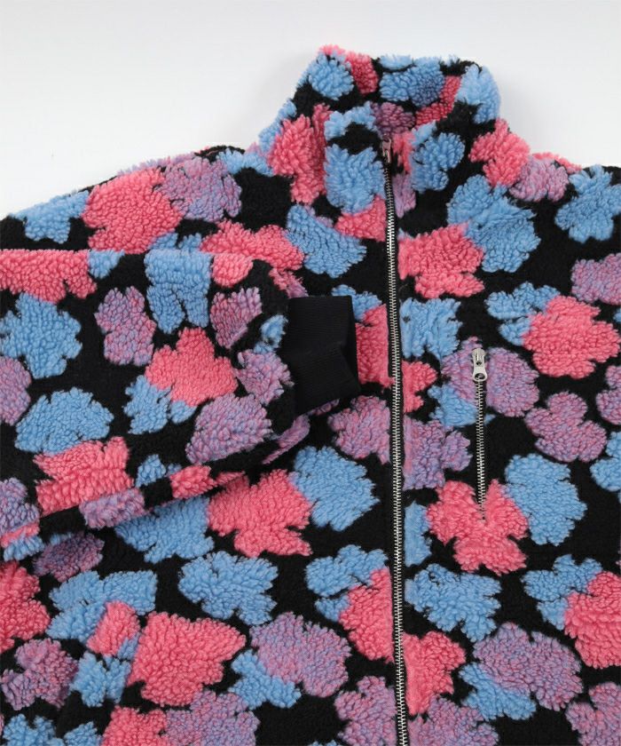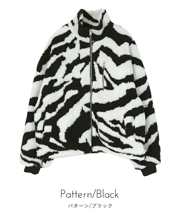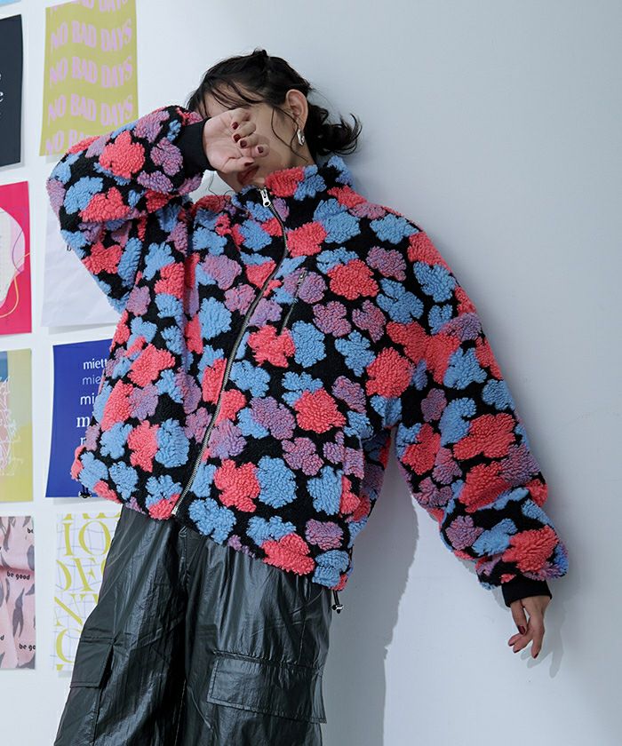・存在感のある総柄のボア素材を使用したブルゾン。