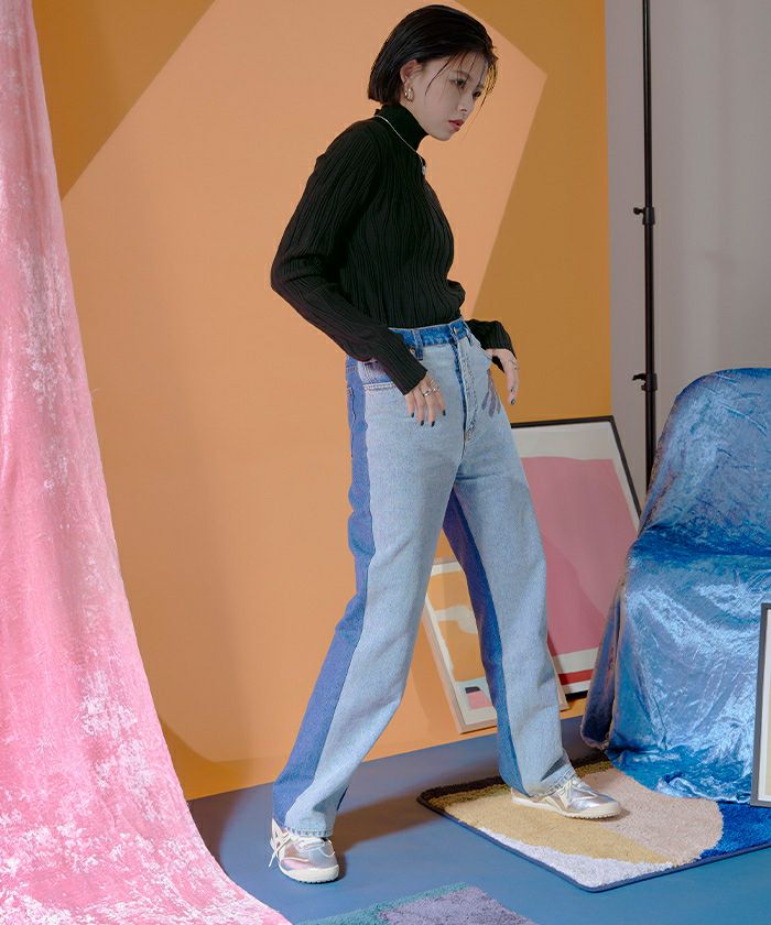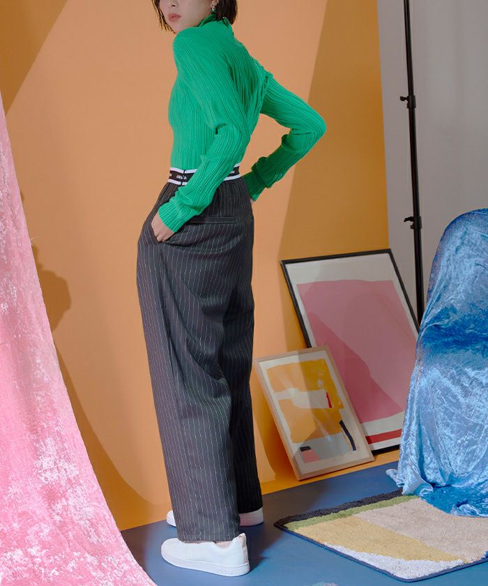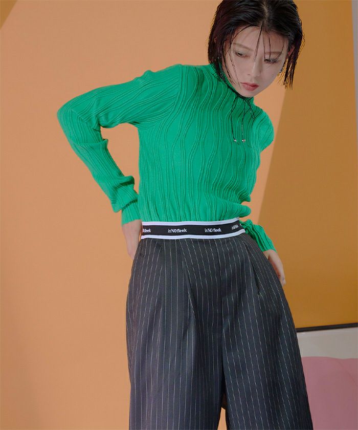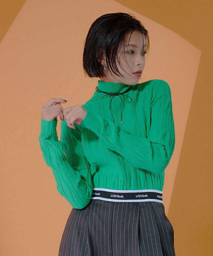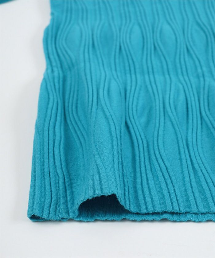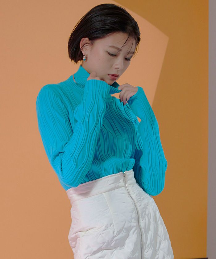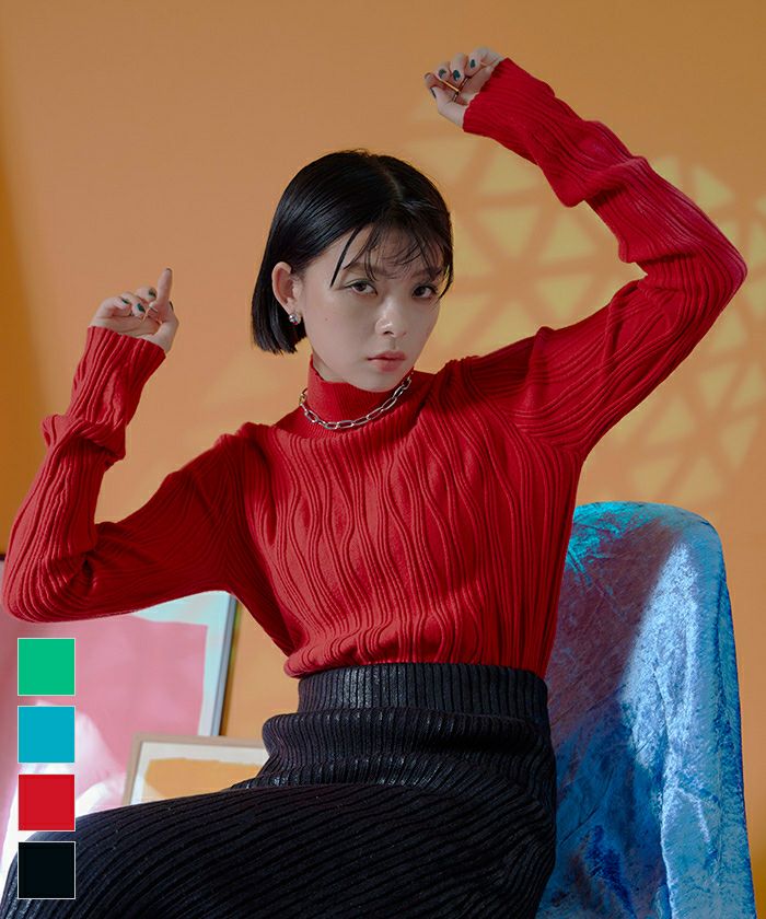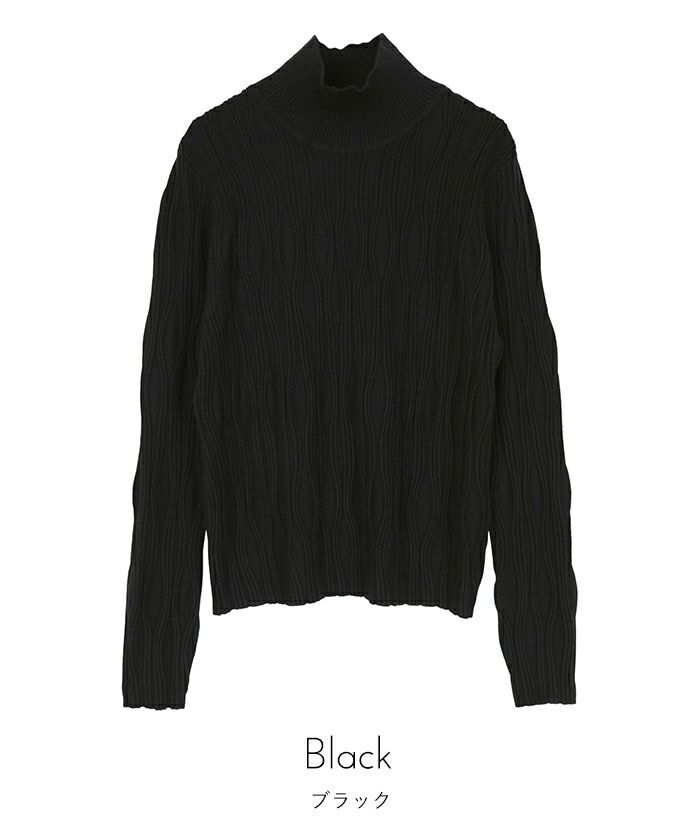・ウェーブの編み地が特徴的なハイネックニットトップス。