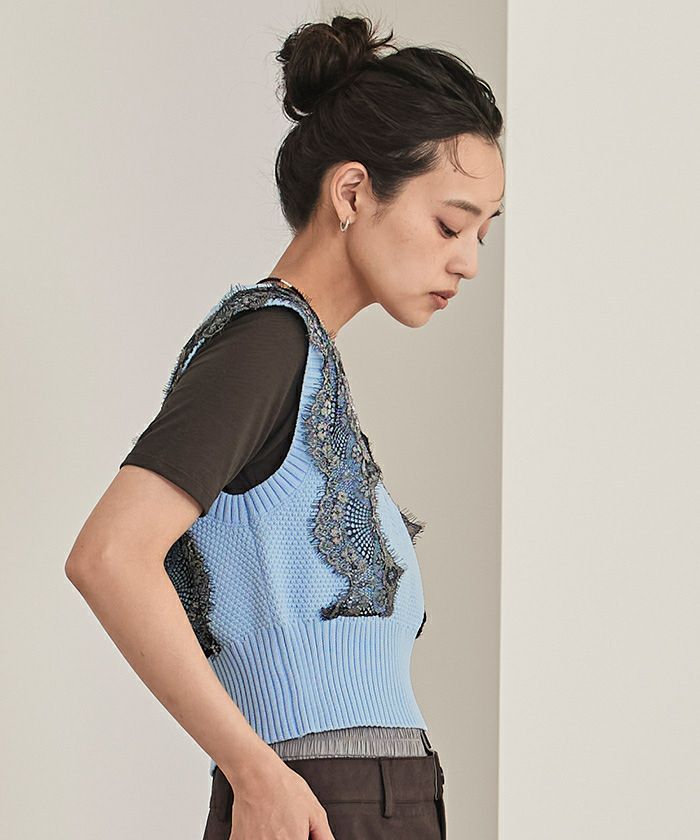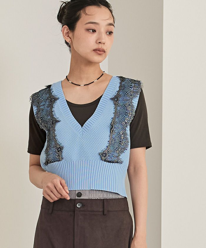 ・ベーシックなニットベストも異素材使いでモードな印象に。