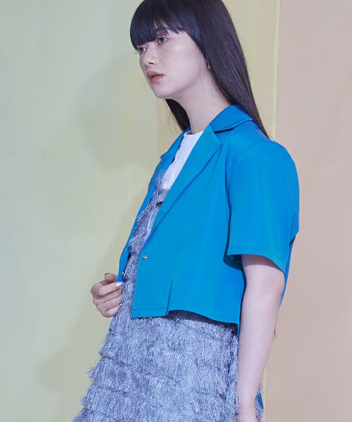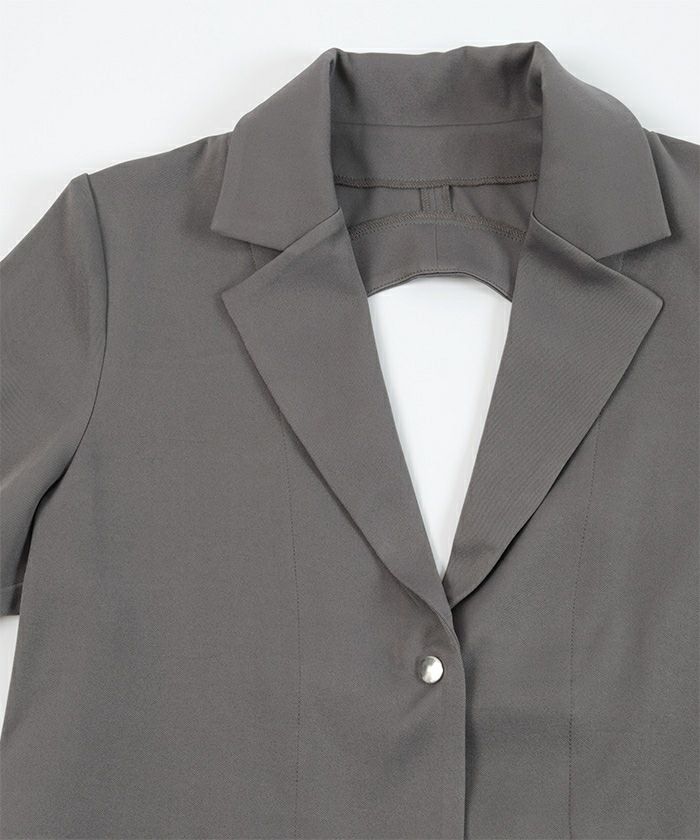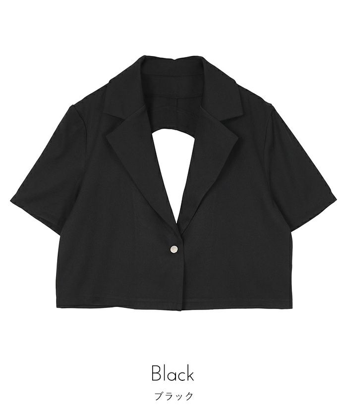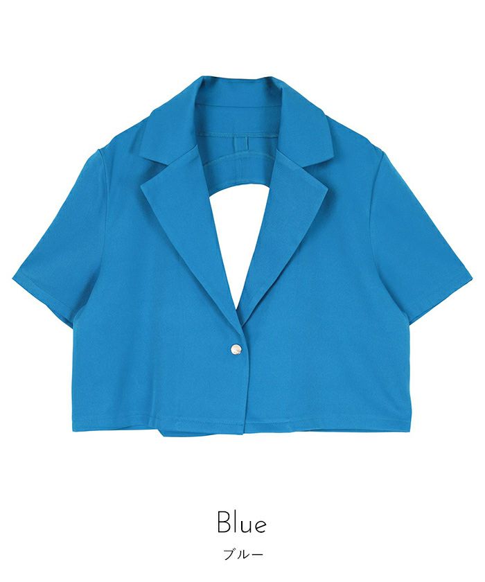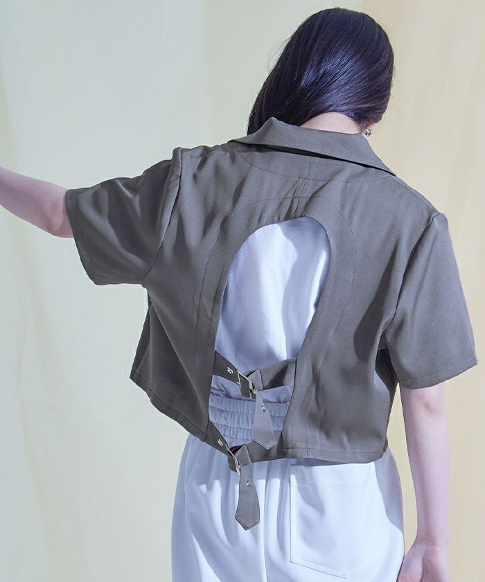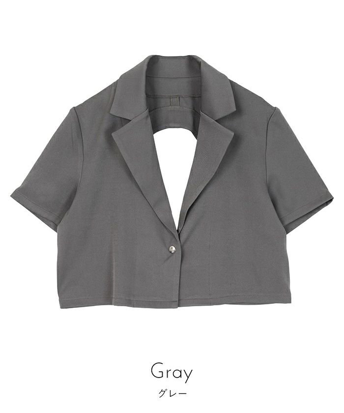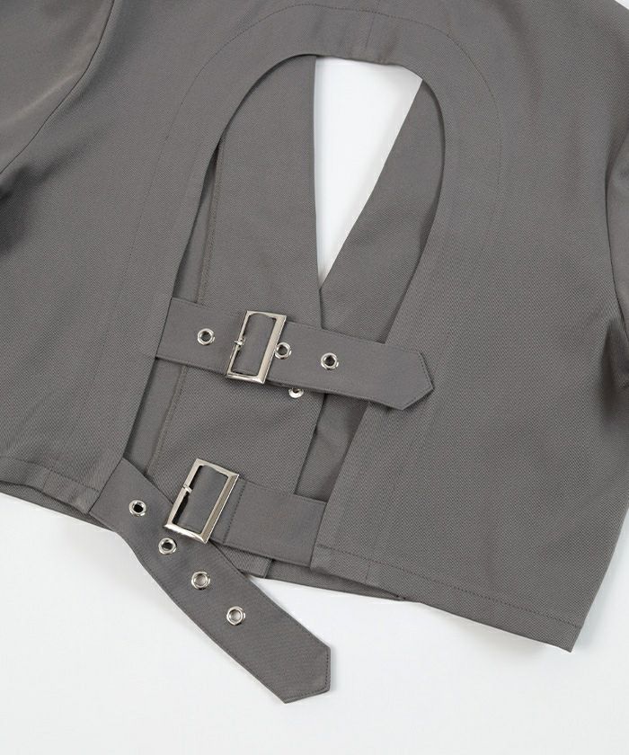 ・バックオープンデザイン+ダブルベルトが印象的な半袖ジャケット。