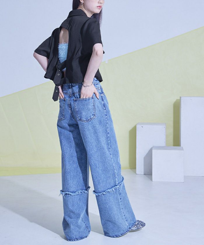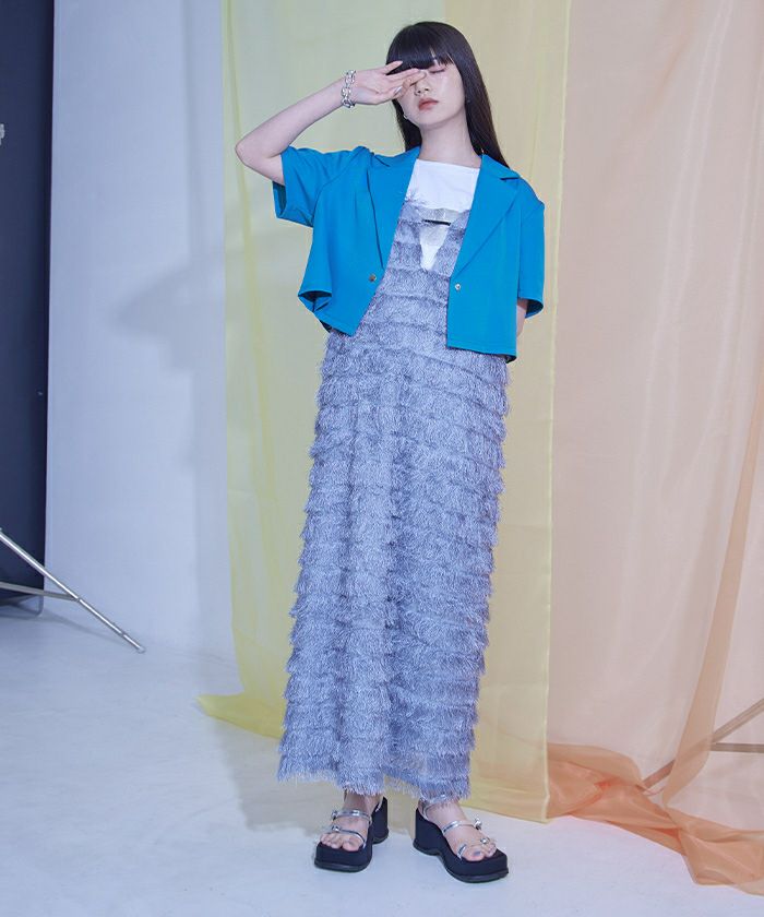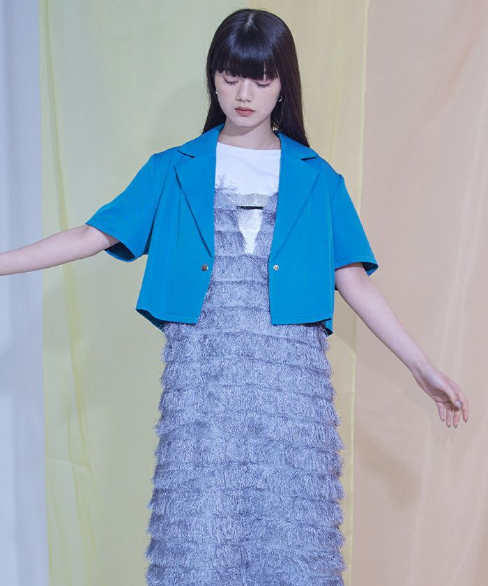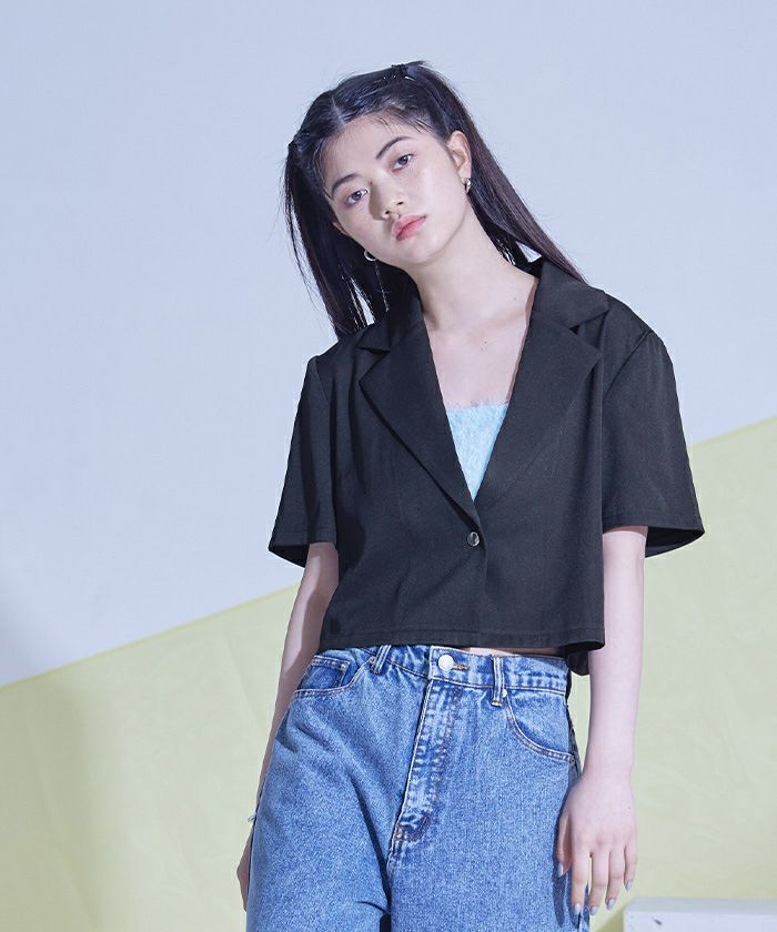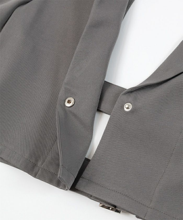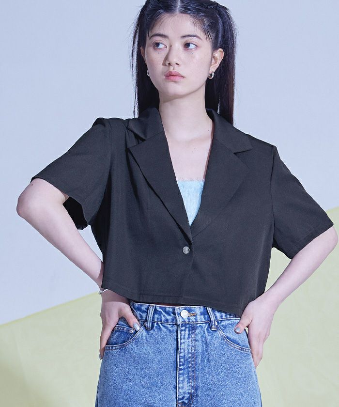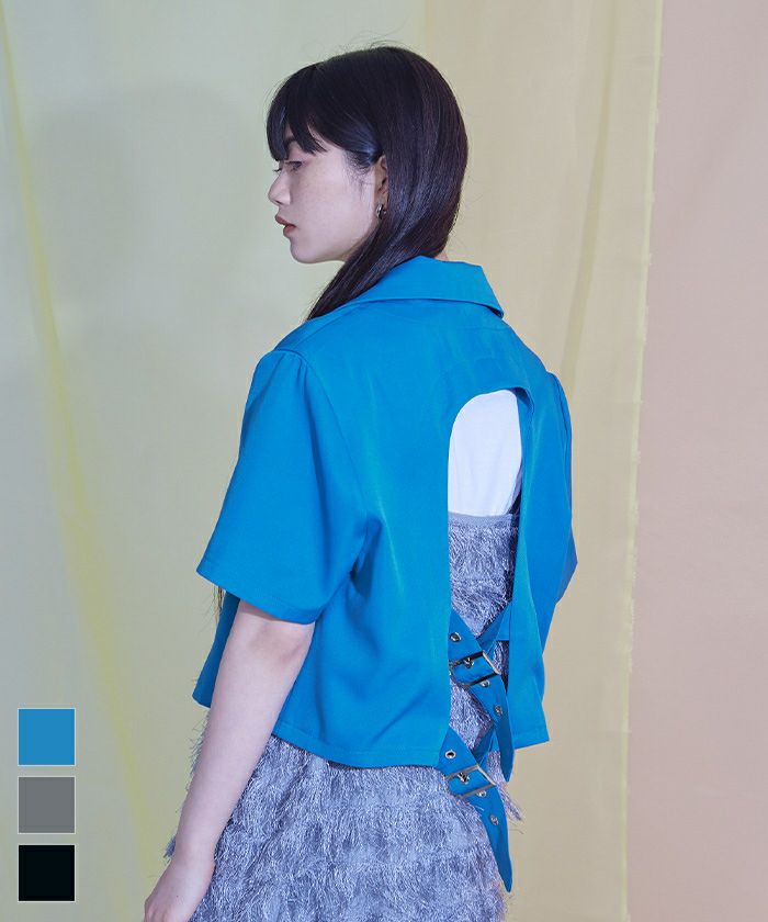 ・バックオープンデザイン+ダブルベルトが印象的な半袖ジャケット。