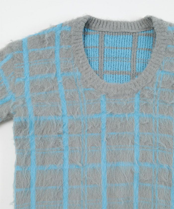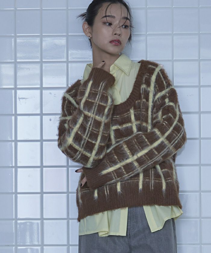 【期間限定★3000均一】 Uネックシャギーチェックニット