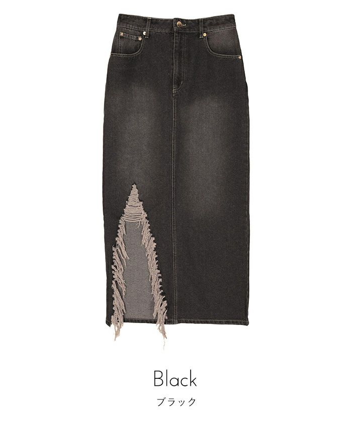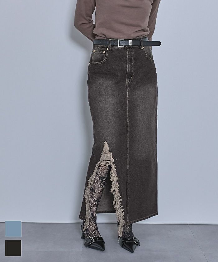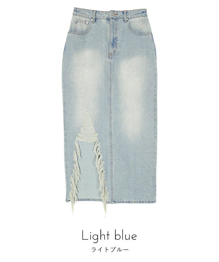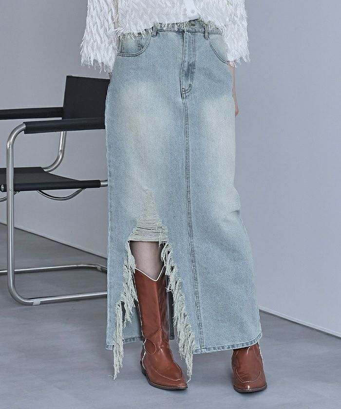 ・フロント部分に施された大胆なダメージデザインが目を引くデニムスカート