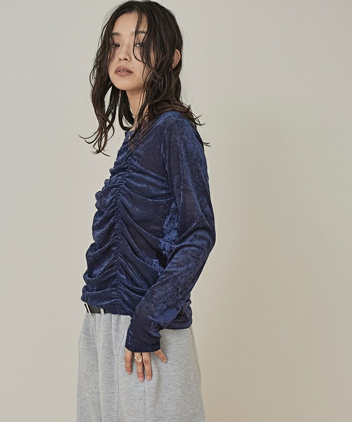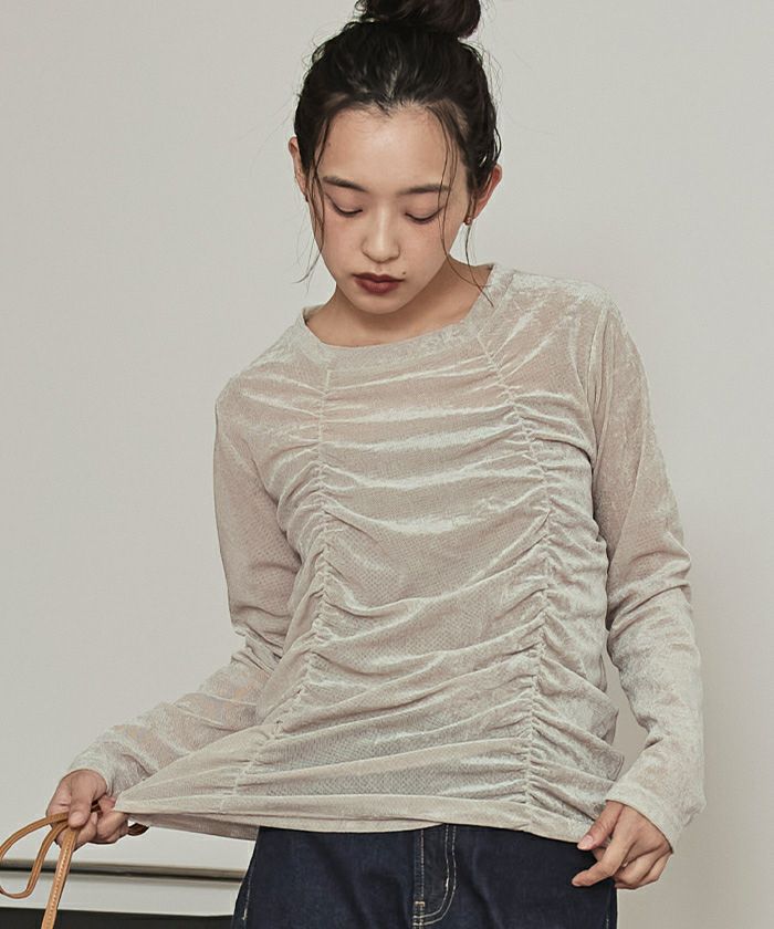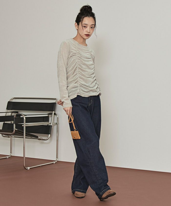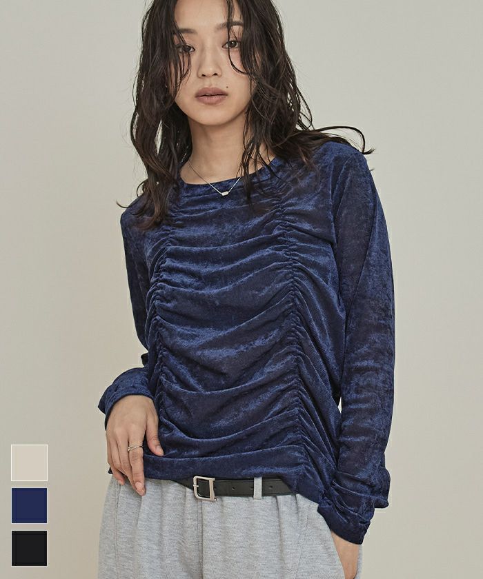 ・長めの袖とサイドギャザーがポイントのデザイントップス