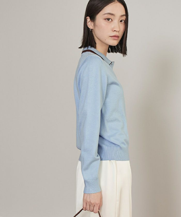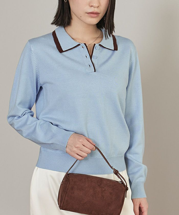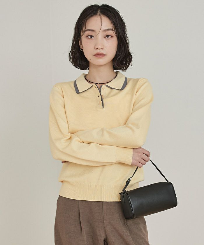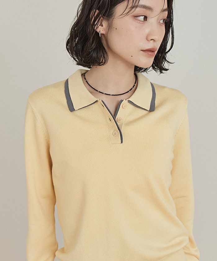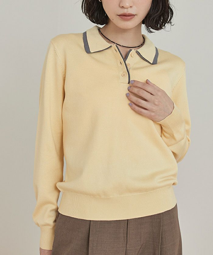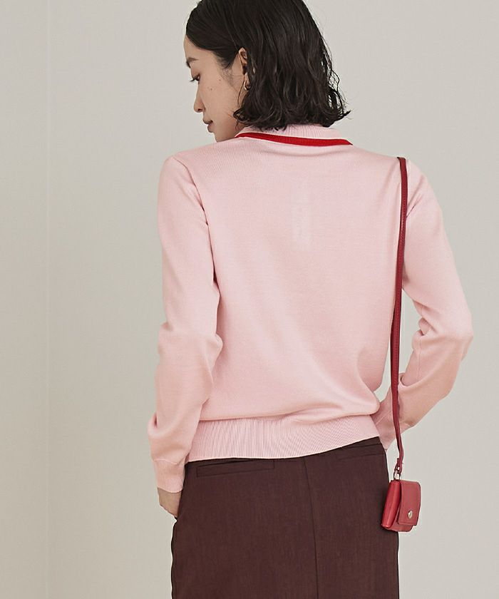 ・襟元と前立ての配色デザインのレイヤード風ニットトップス