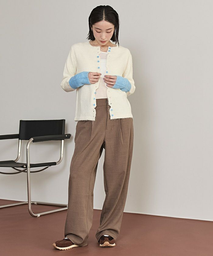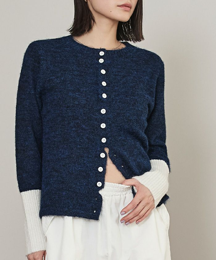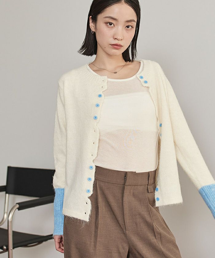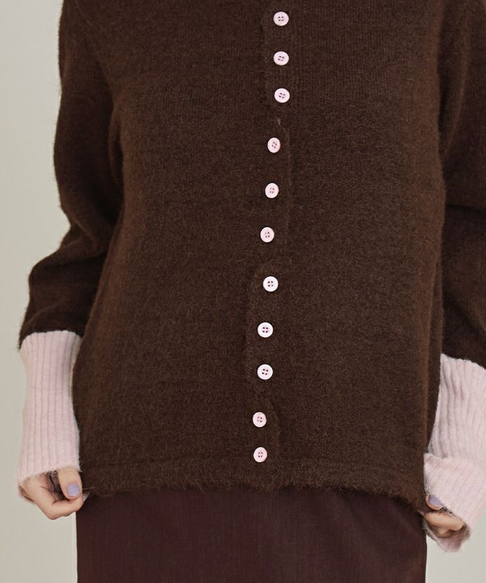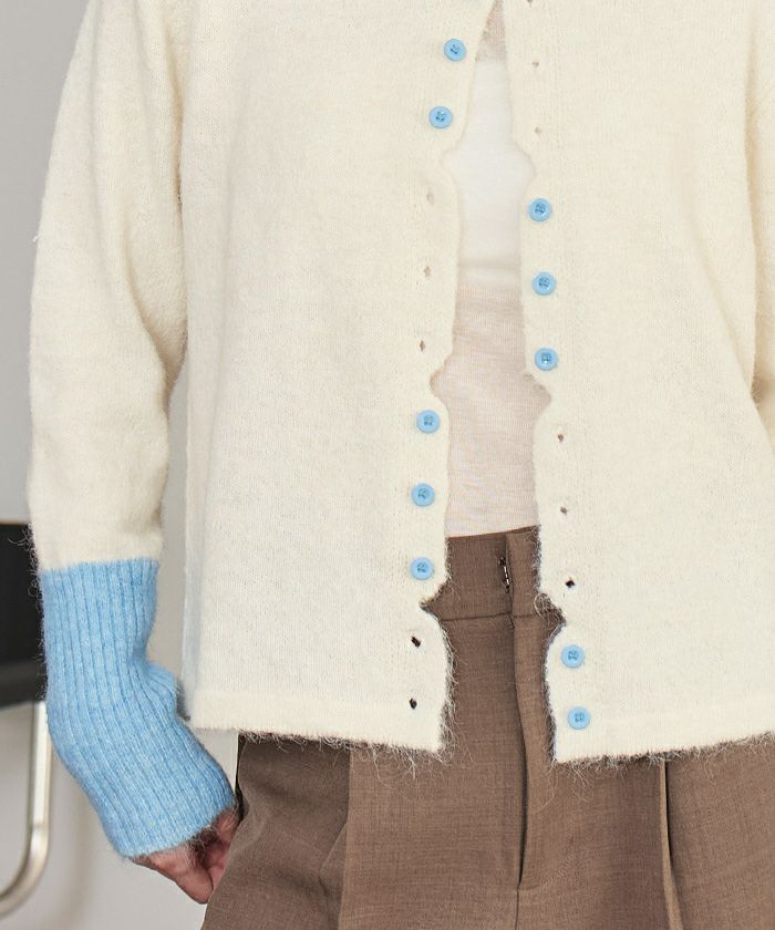・カラフルなボタンと袖口の配色が目を引くデザインカーディガン