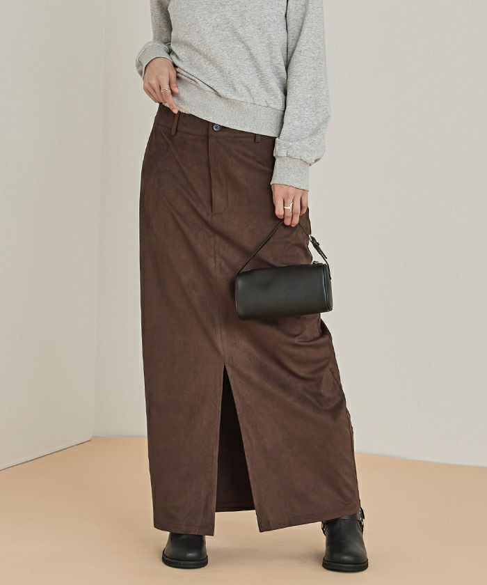 ・滑らかな手触りとツヤ感が魅力のフェイクスエード素材を使用したWウエストロングスカート