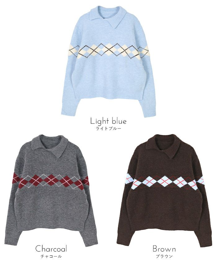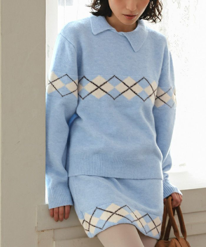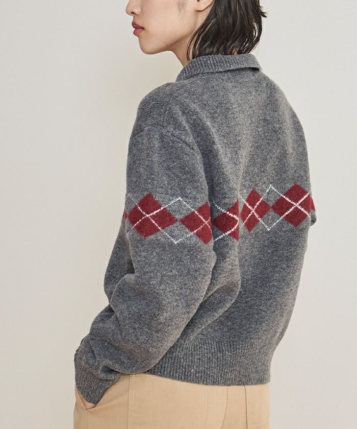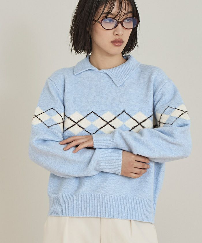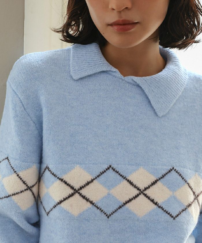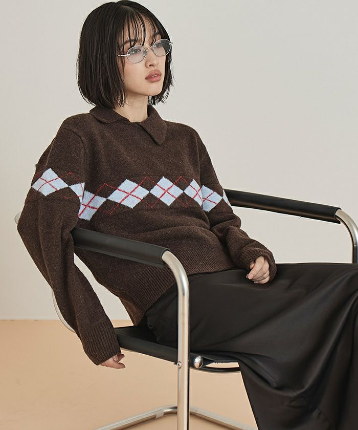 商品情報 ・斜めになったアシンメトリーカラーがポイントのアーガイル柄のニット