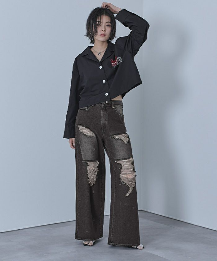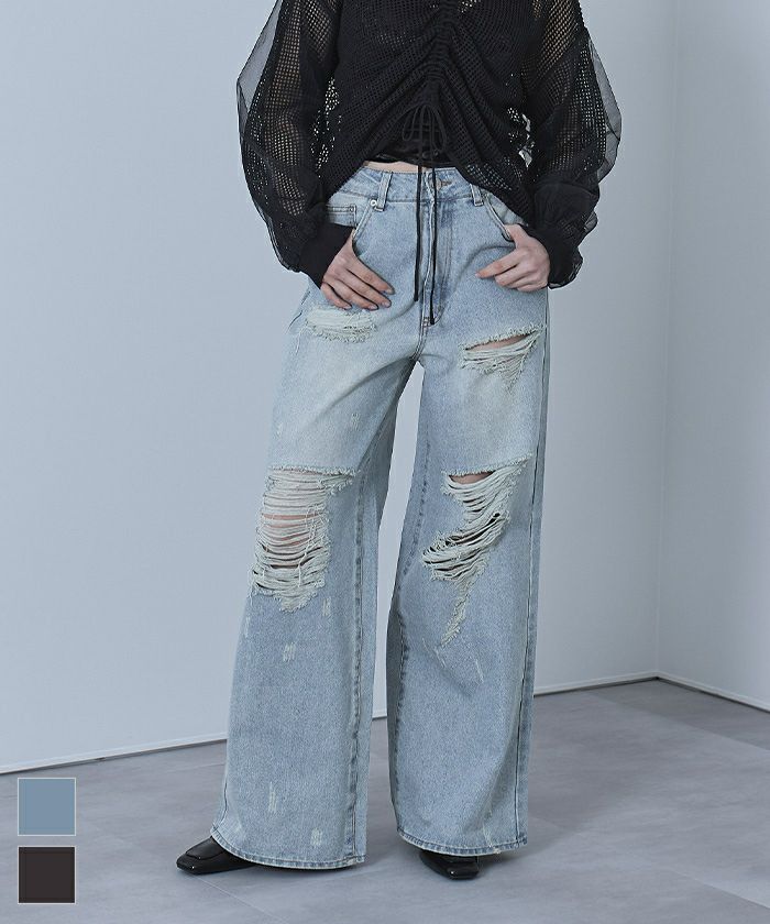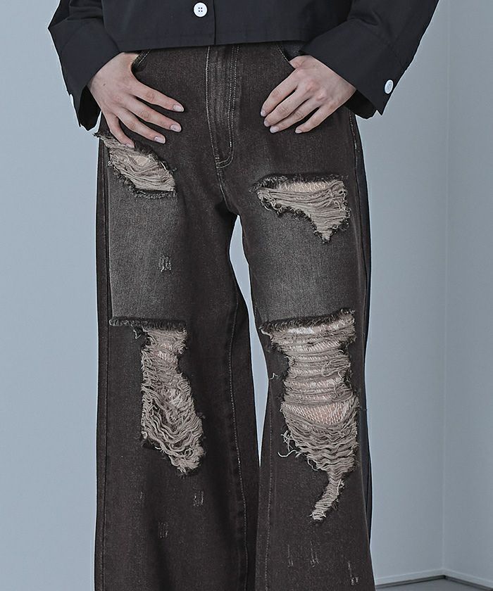 ・フロント部分に施された大胆なダメージデザインがポイントのデニムパンツ