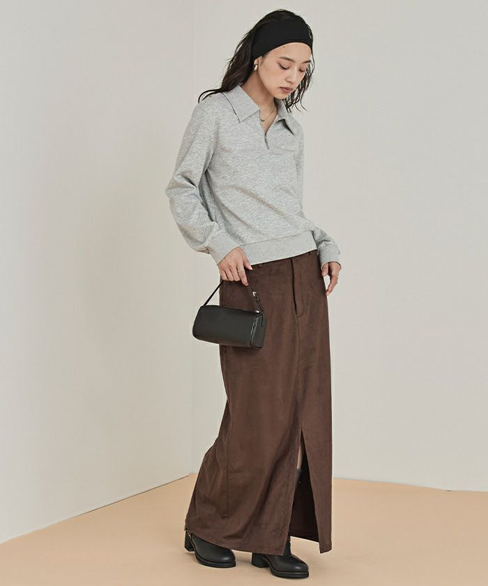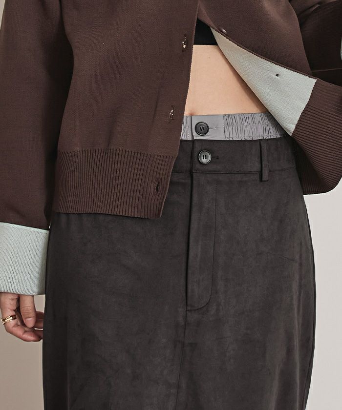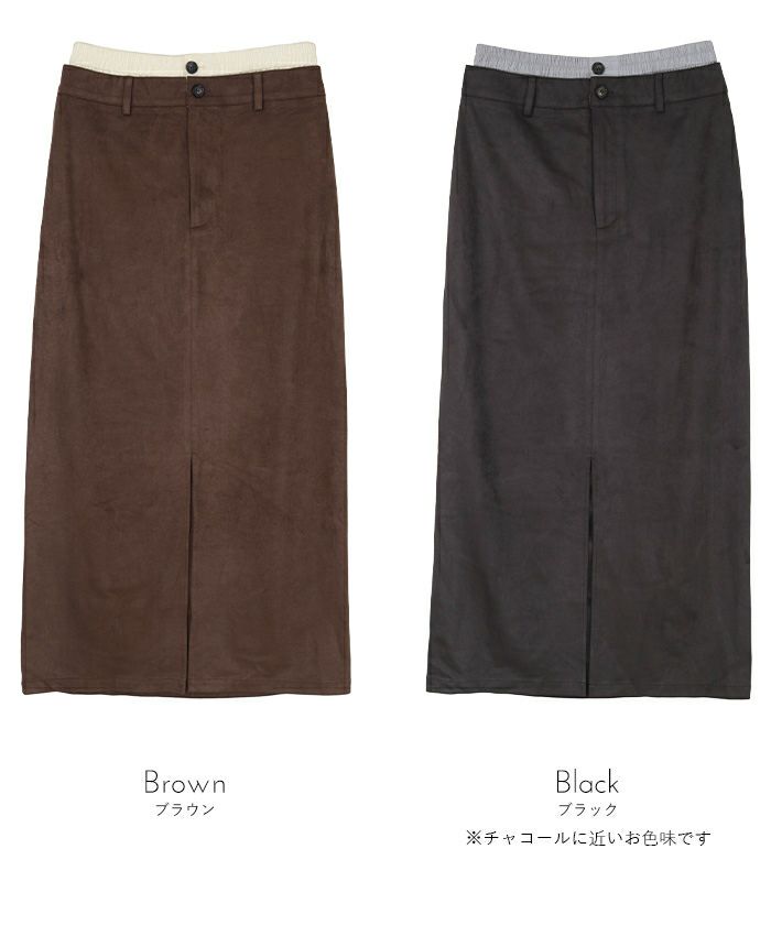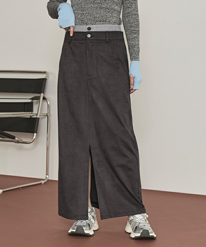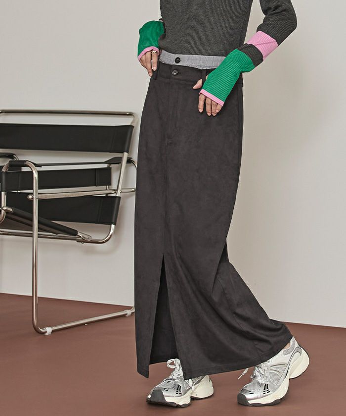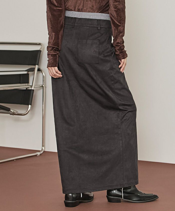 ・滑らかな手触りとツヤ感が魅力のフェイクスエード素材を使用したWウエストロングスカート