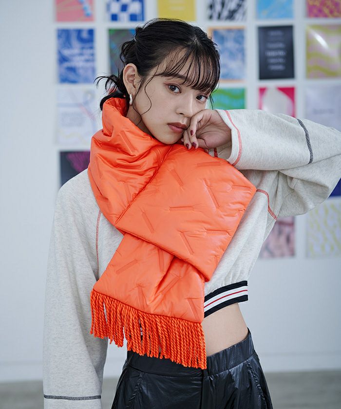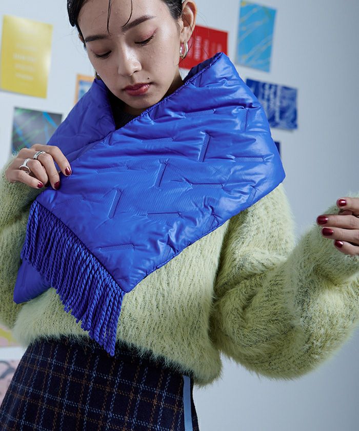 ・存在感のあるキルティングデザインのフリンジマフラー。