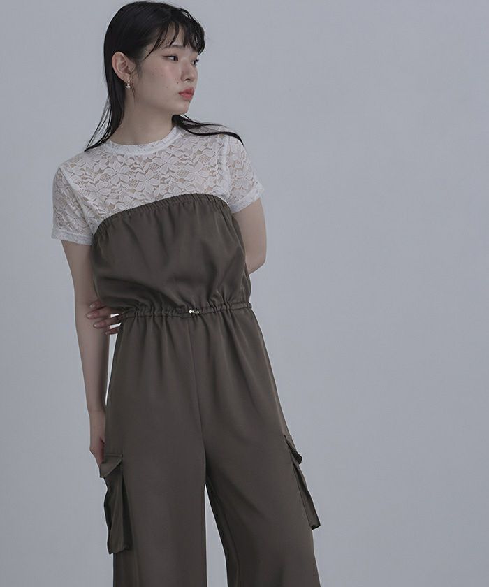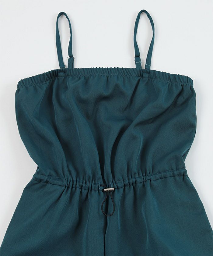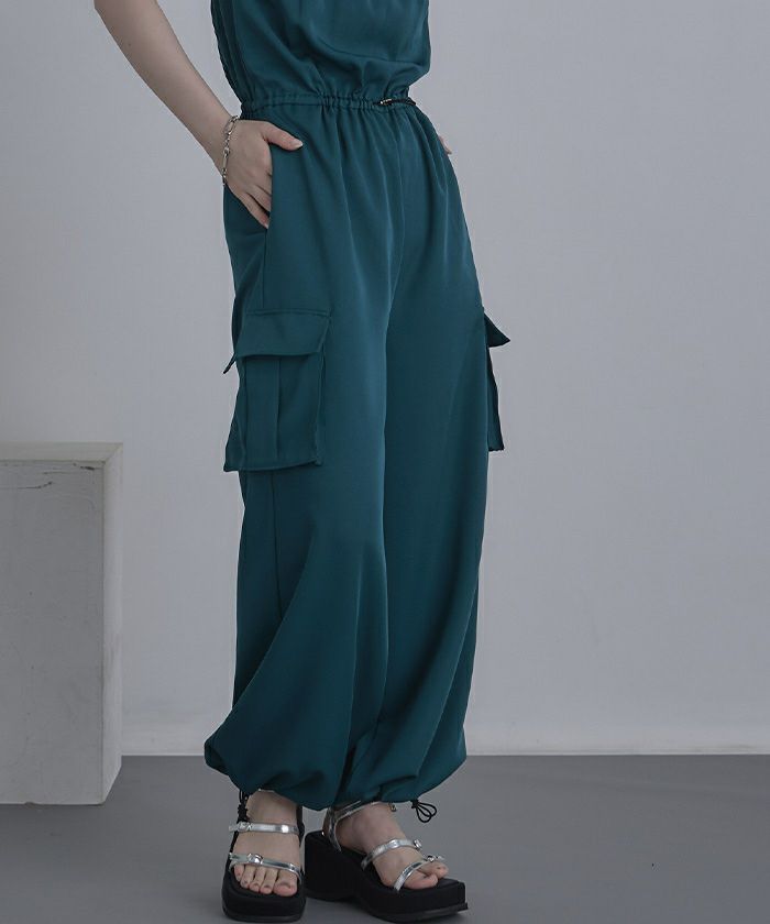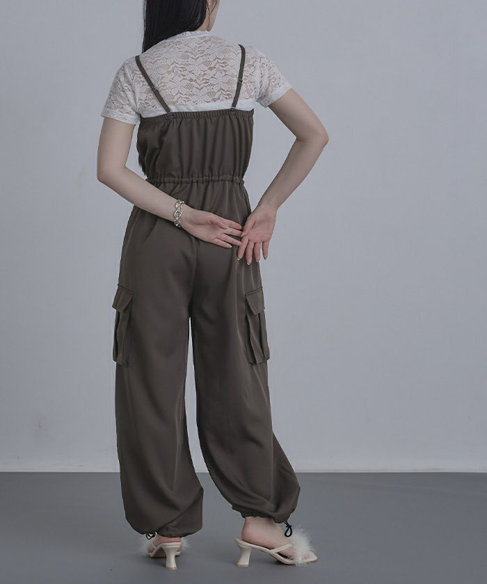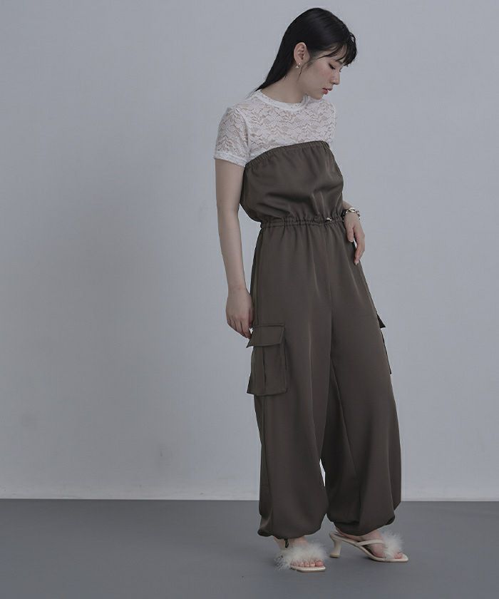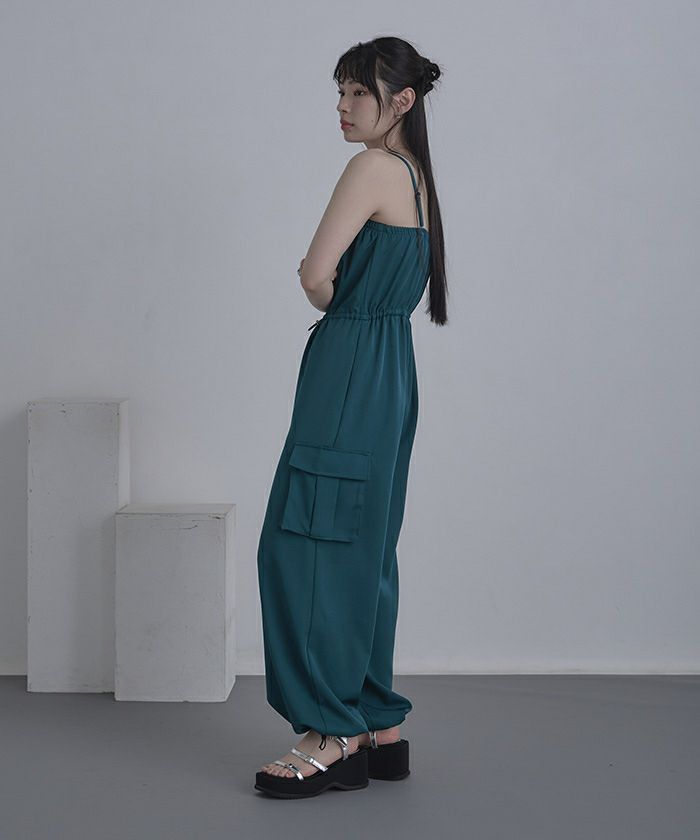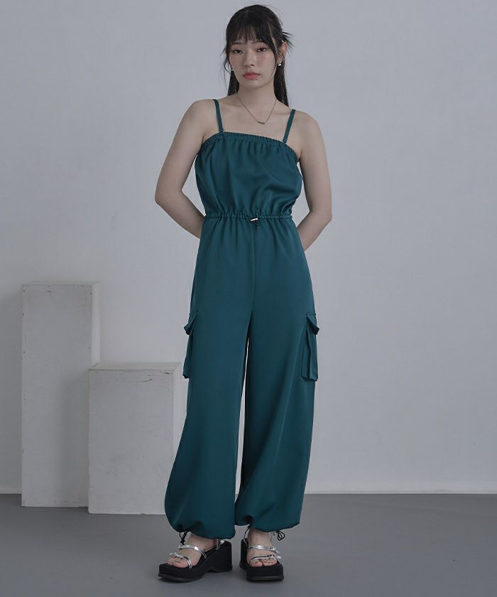 ・ウエストと裾にドロストデザインを入れたオールインワン。
