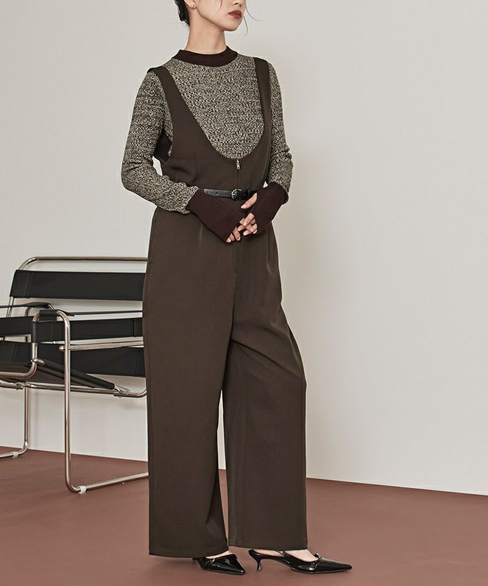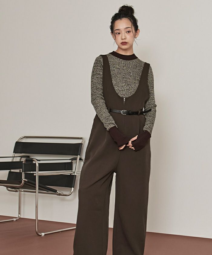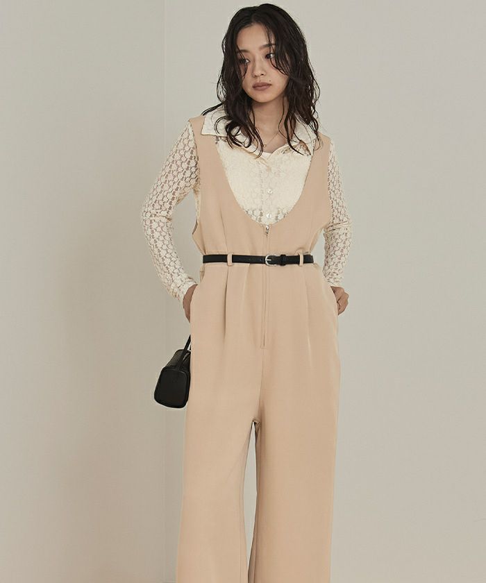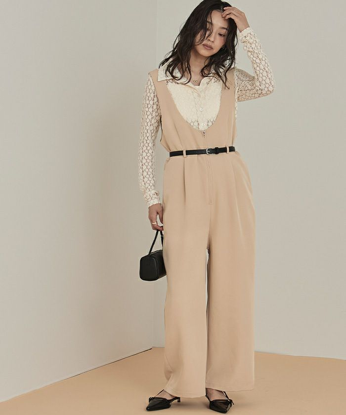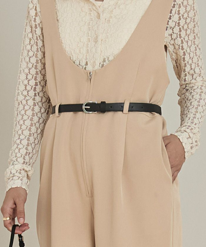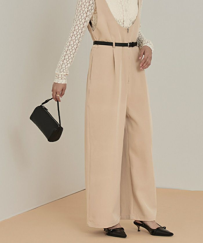 ・深めのUネックがポイントのベルト付きサロペットパンツ。