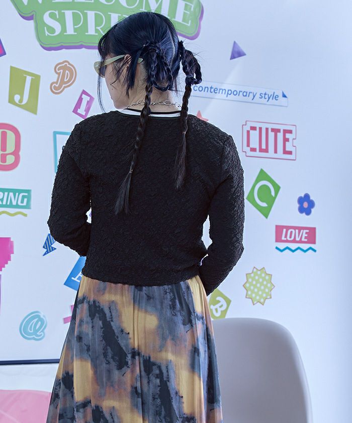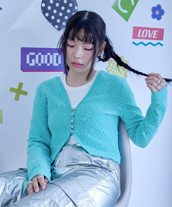 ・表面感がかわいいジャガードカットソー素材のカーディガン。