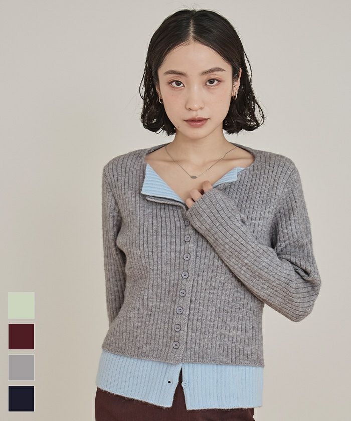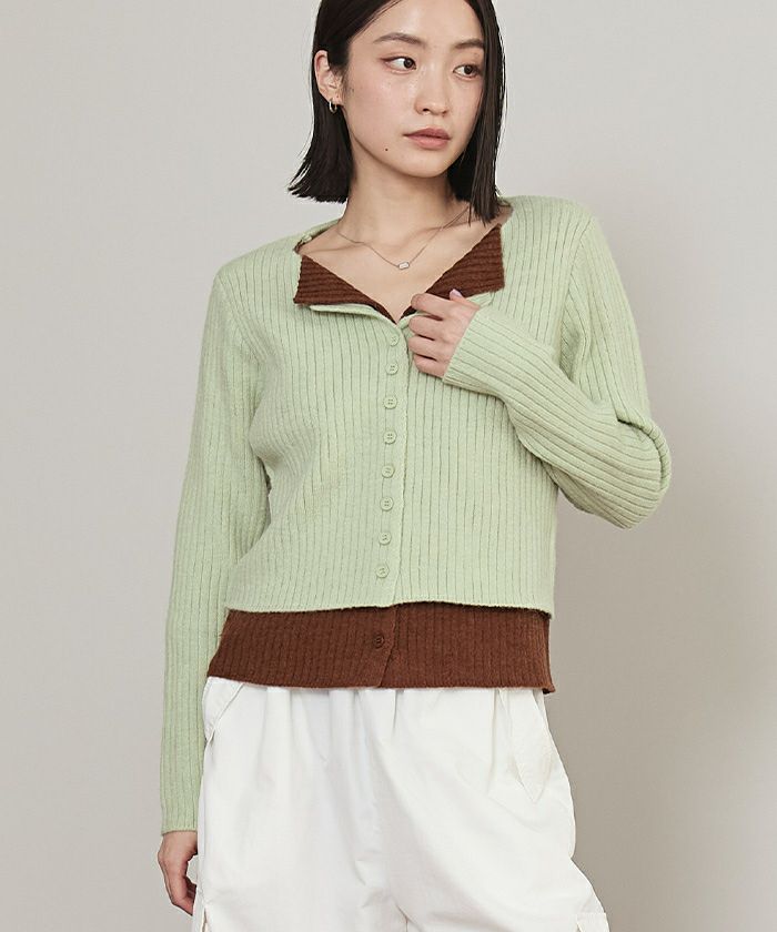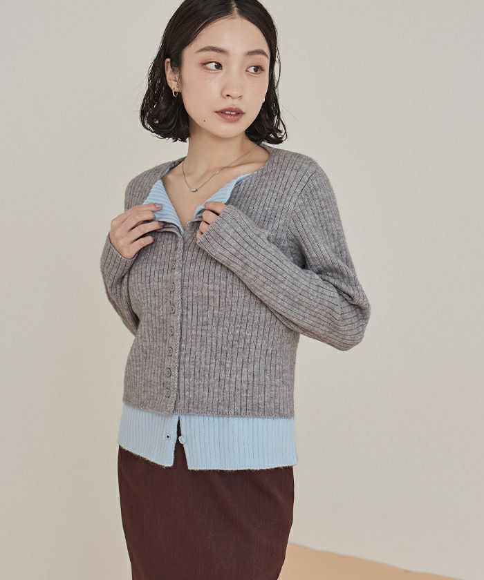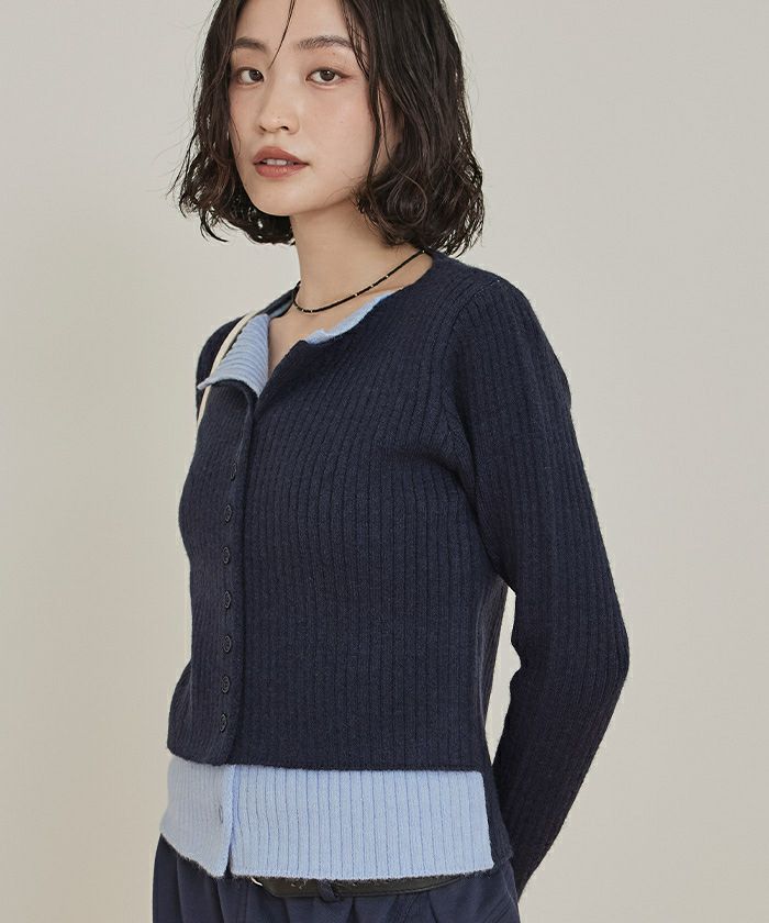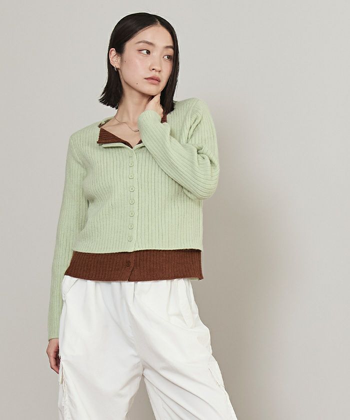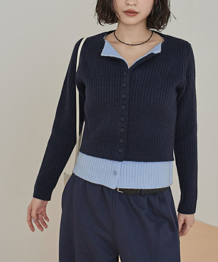 ・2枚重ねて着ているようなレイヤード風デザインが目を惹くニットカーディガン
