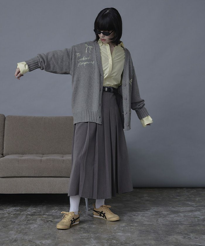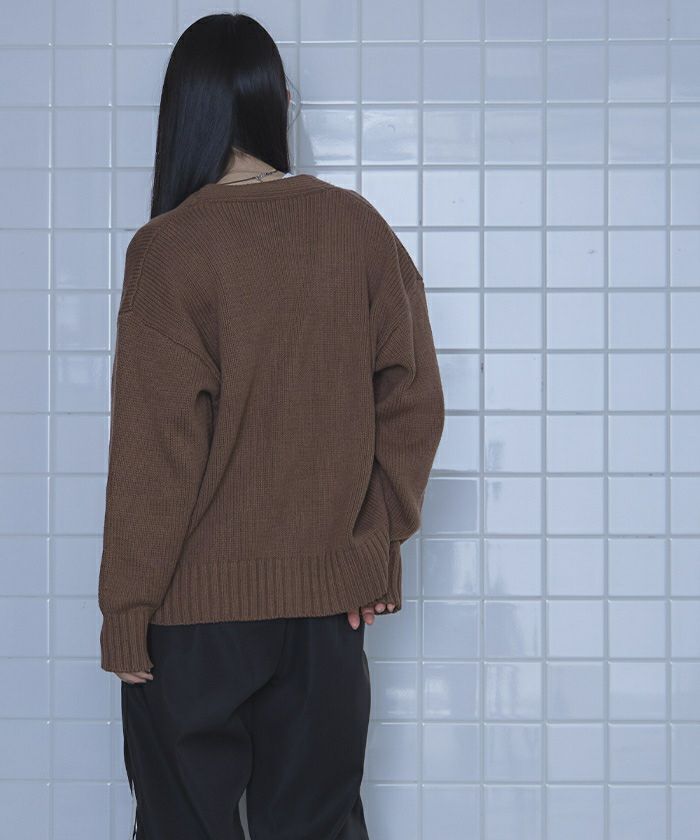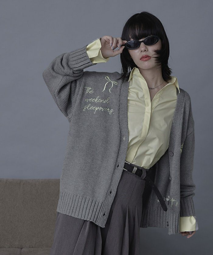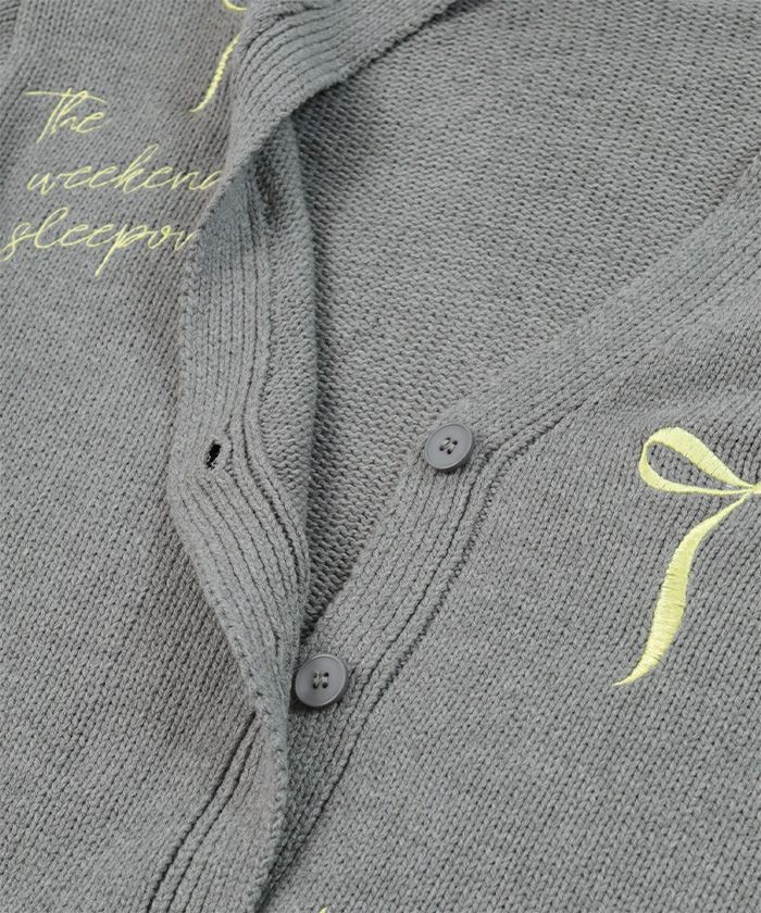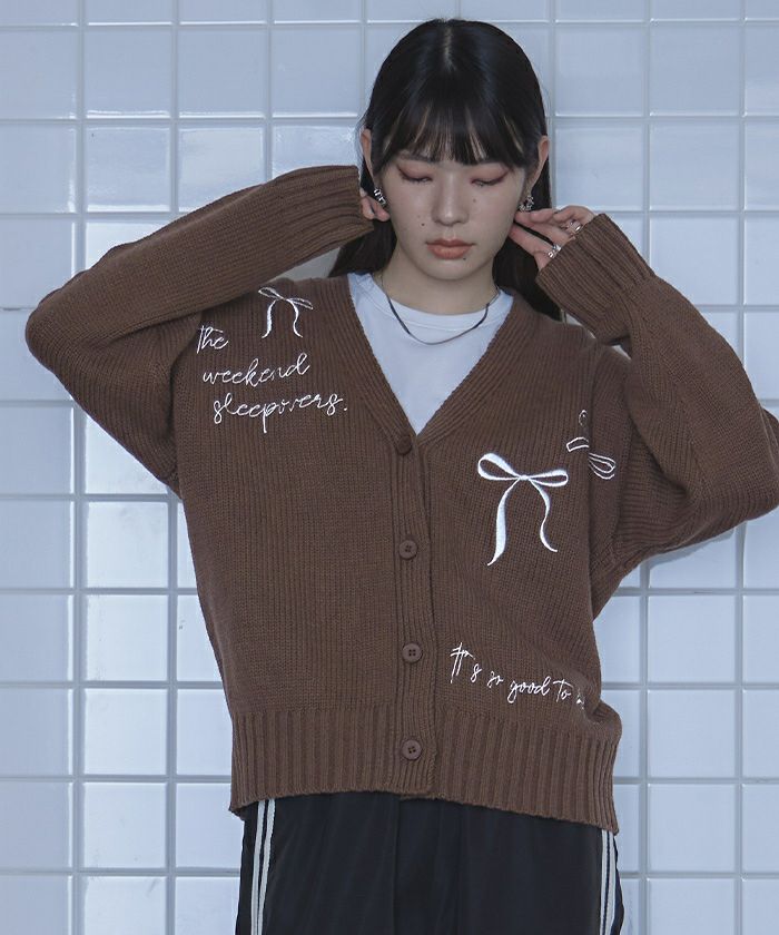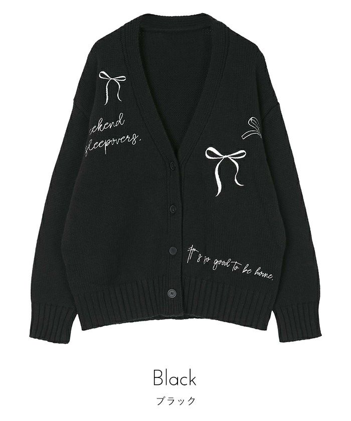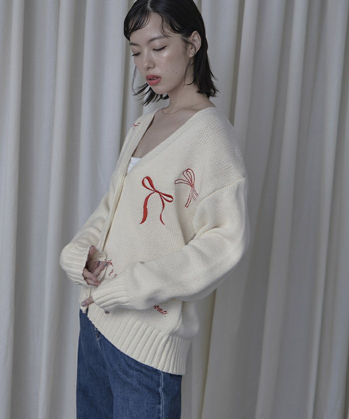 ・リボンとロゴの刺繍が施されたVネックニットカーディガン。