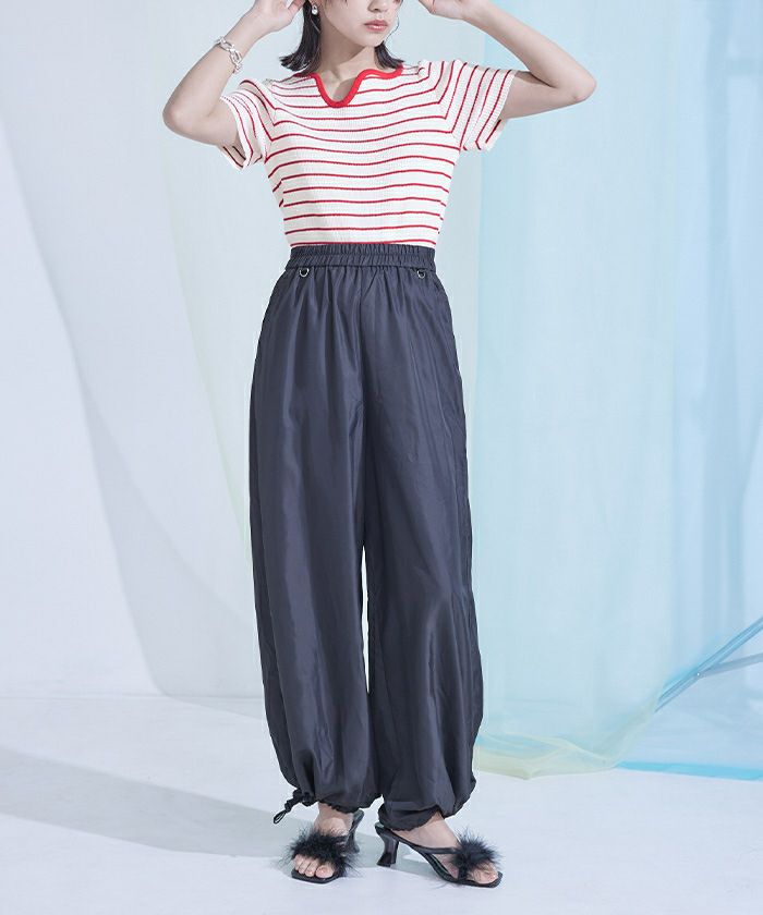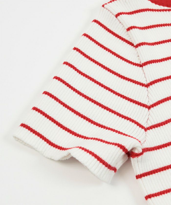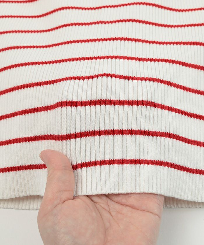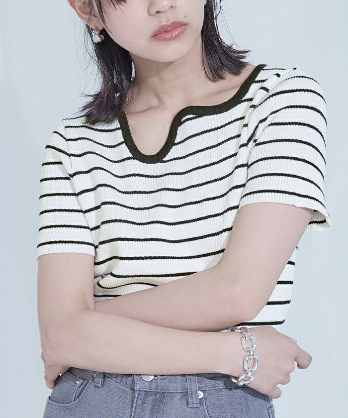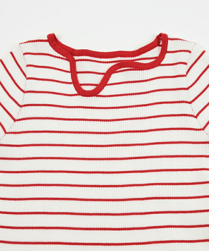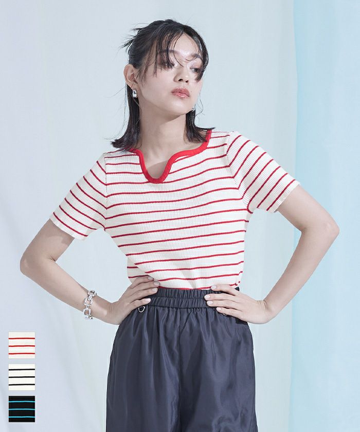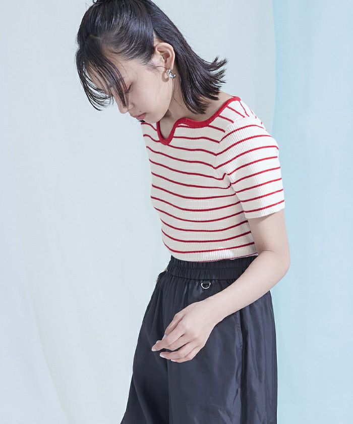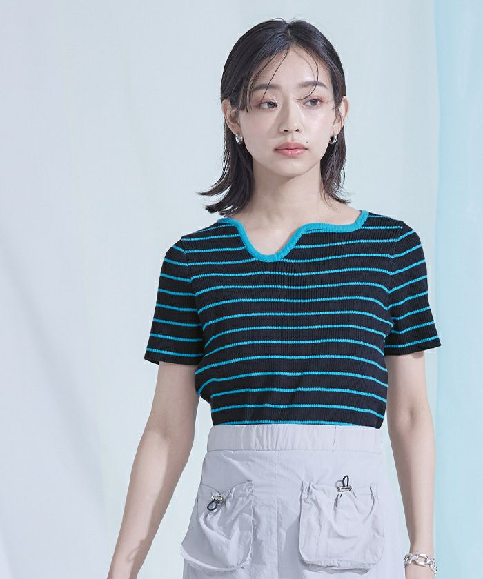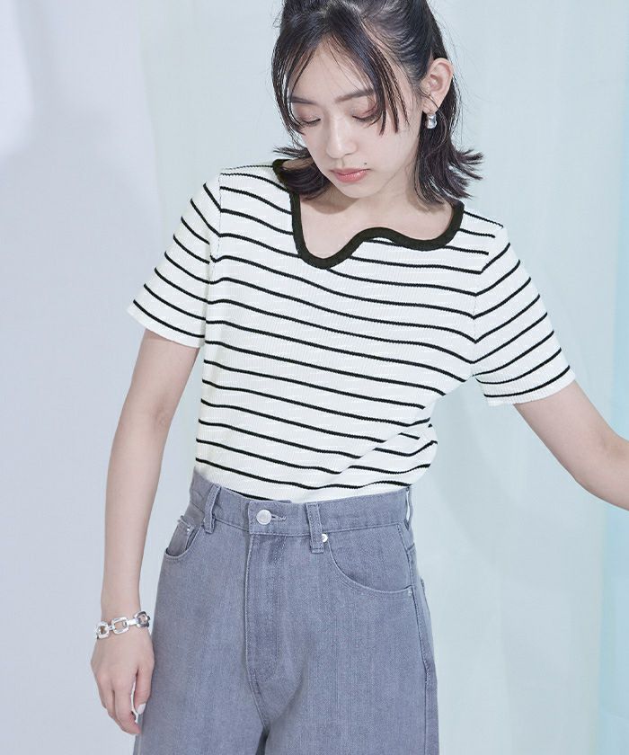 ウェーブネックラインボーダー半袖トップス〔メール便可/100〕