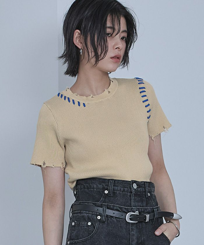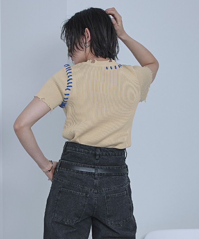 ・アシンメトリーな配色ステッチデザインが目を引くトップス