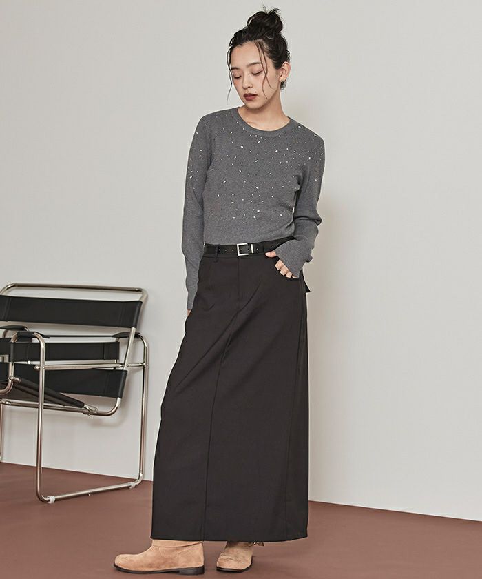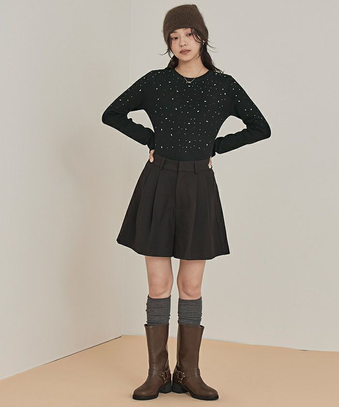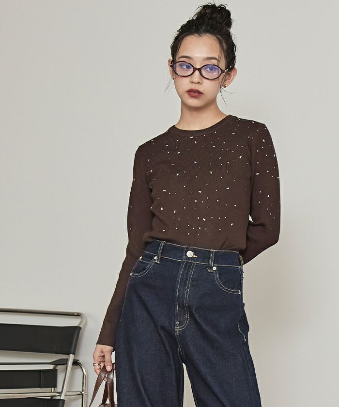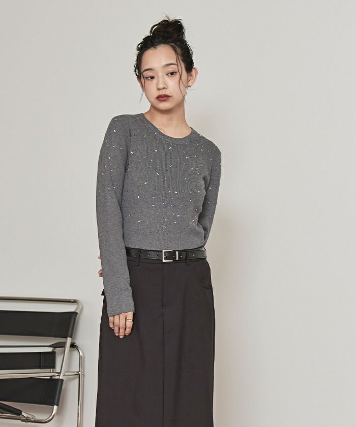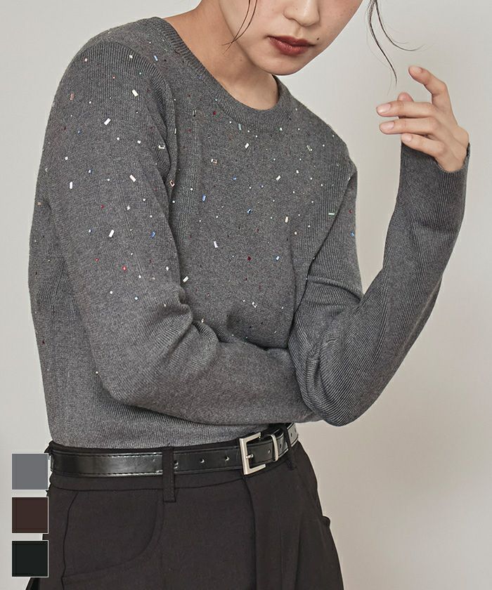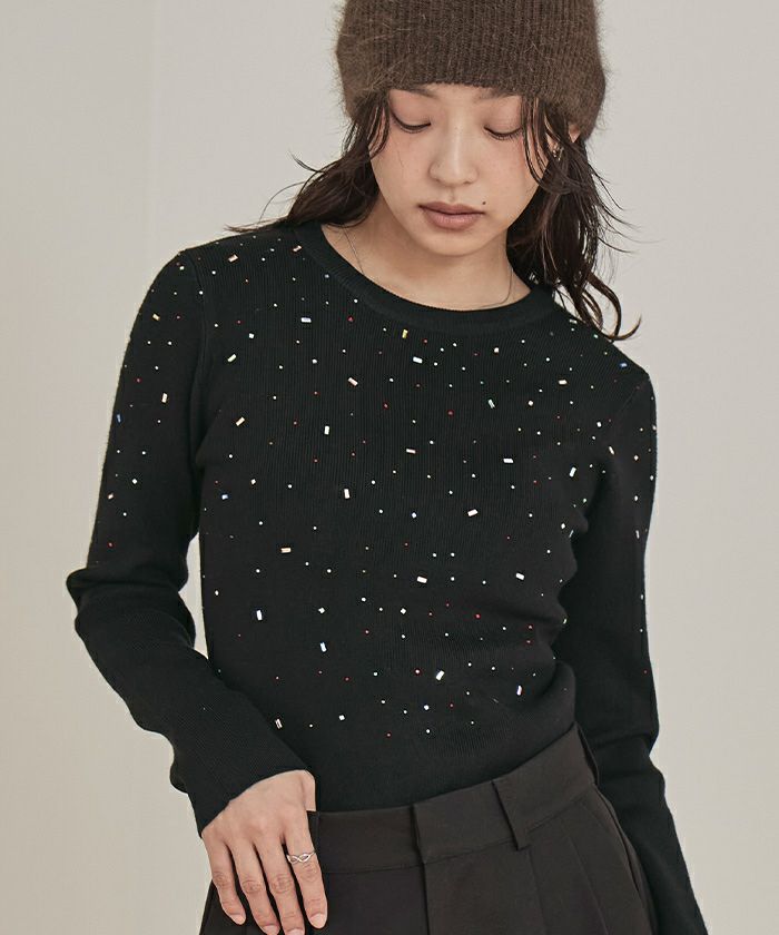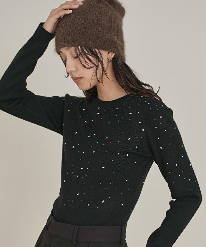 ・大小様々な配色のビジューを散りばめた洗練されたクルーネックニット