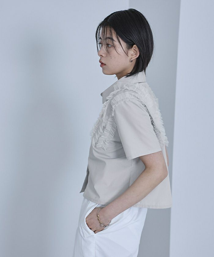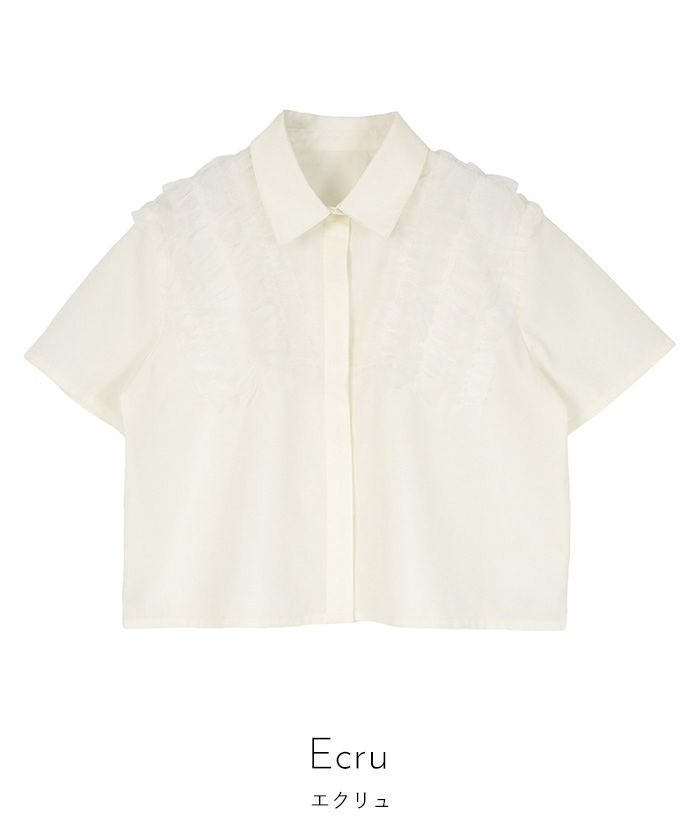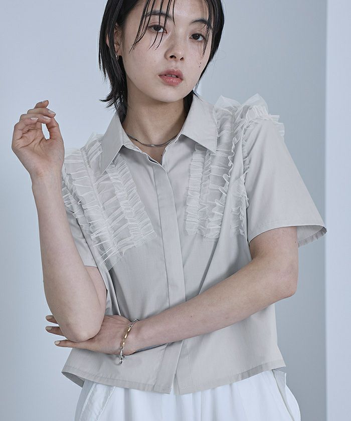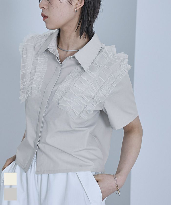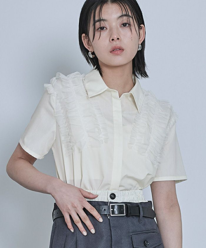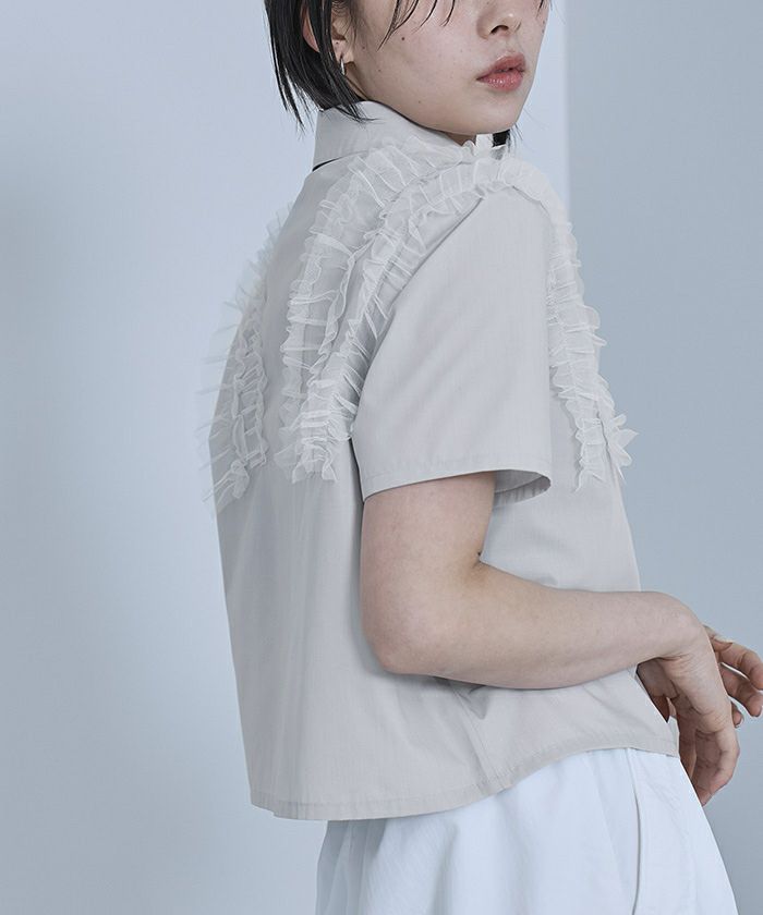 ・チュールフリルが女性らしい半袖シャツ