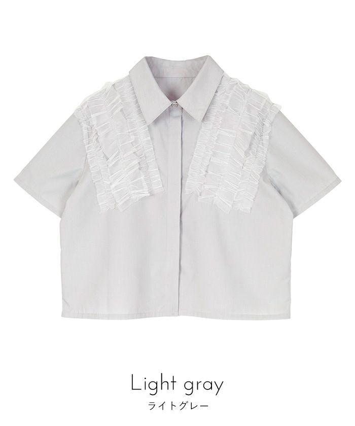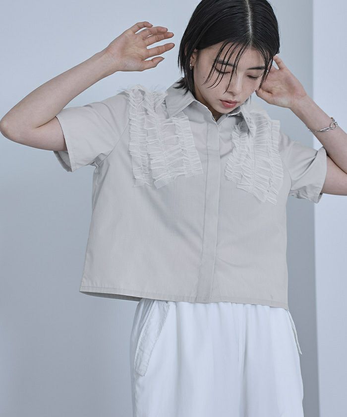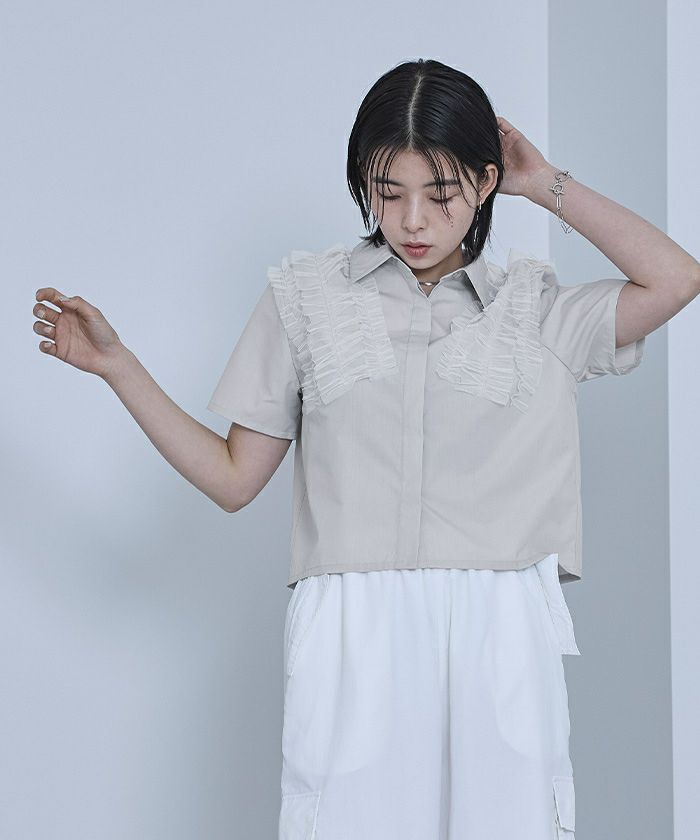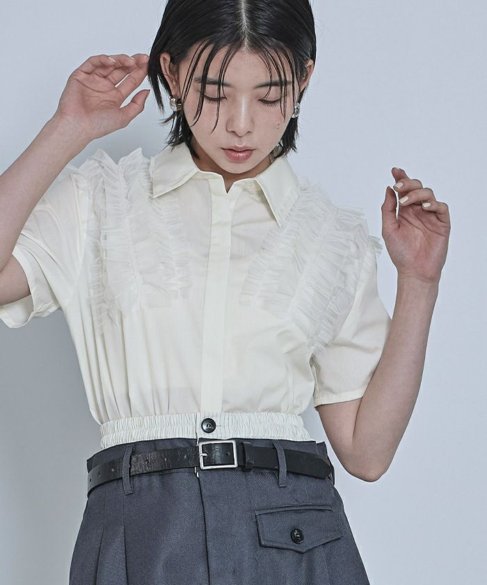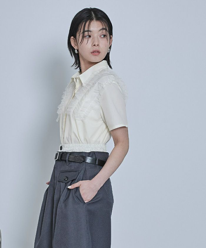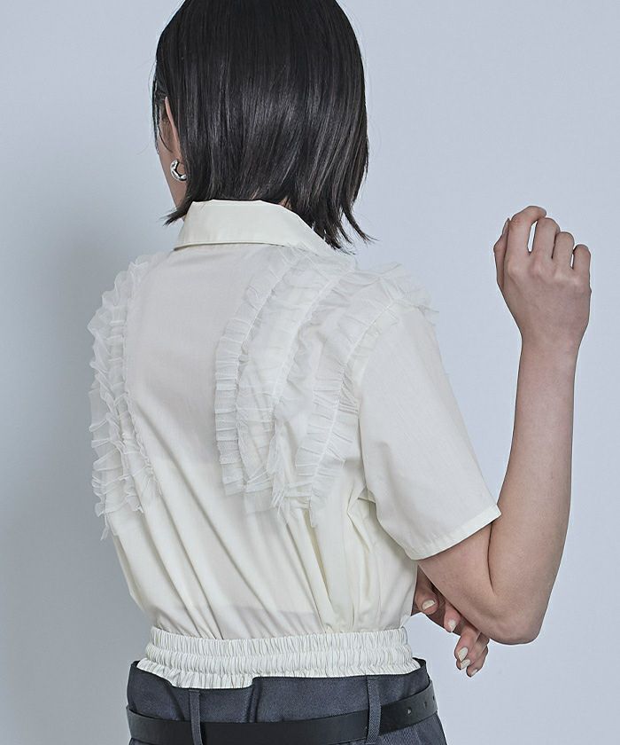 ・チュールフリルが女性らしい半袖シャツ