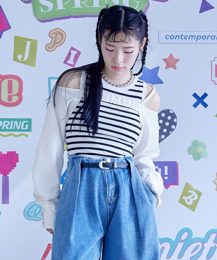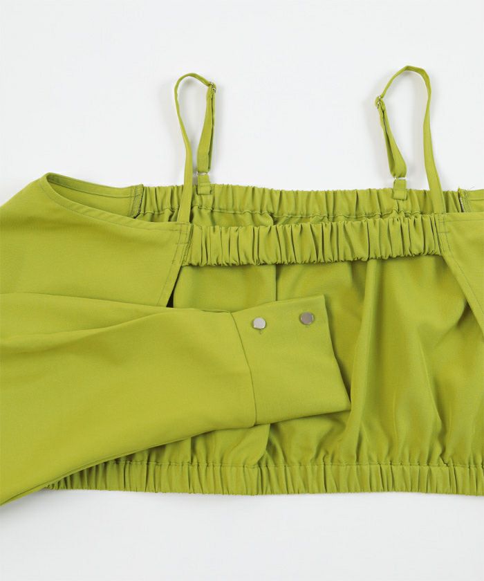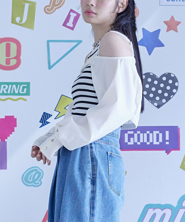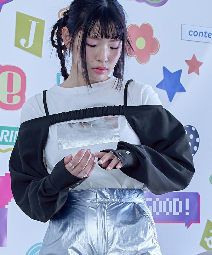 ・ゆるっとした抜け感を演出するオフショルダーアームボレロ。