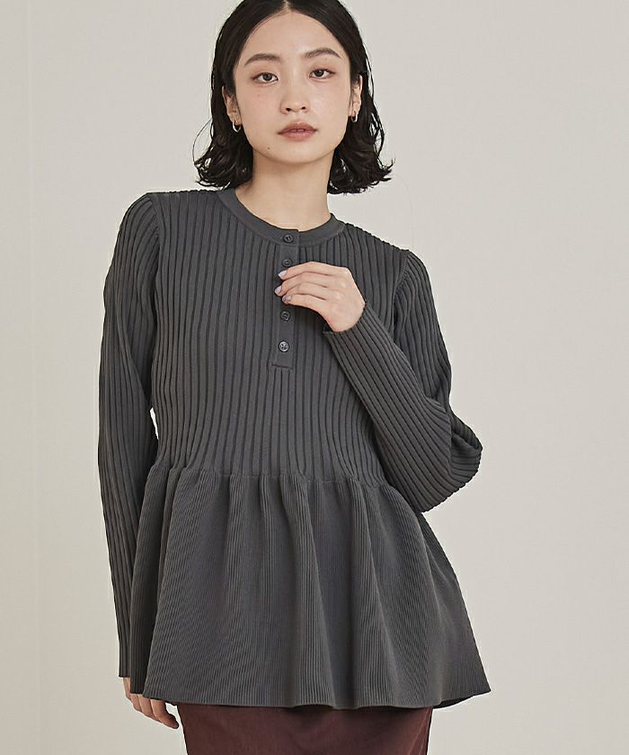 ・トレンドのヘンリーネックが引き立つ、ペプラムラインのリブニット