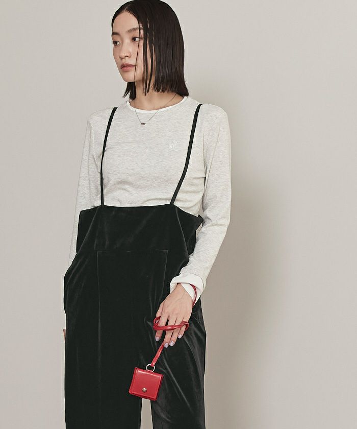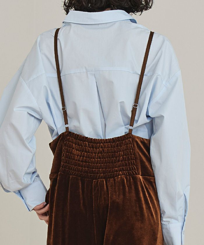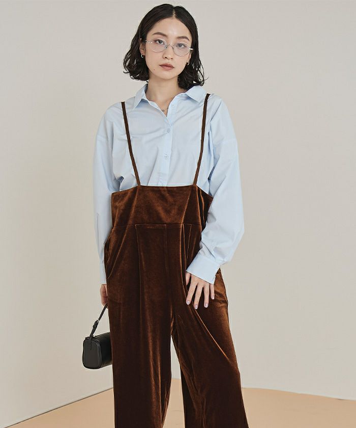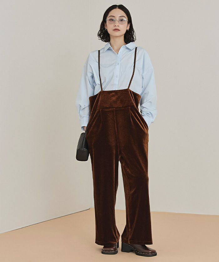 ・上品な光沢と表面が大人っぽいベロア素材が目を引く、サロペット