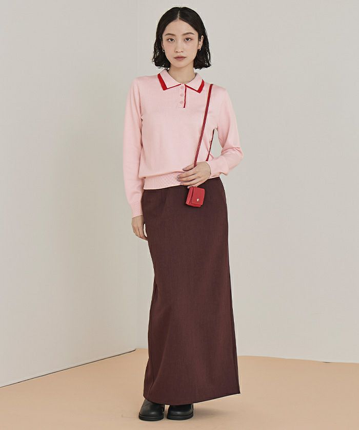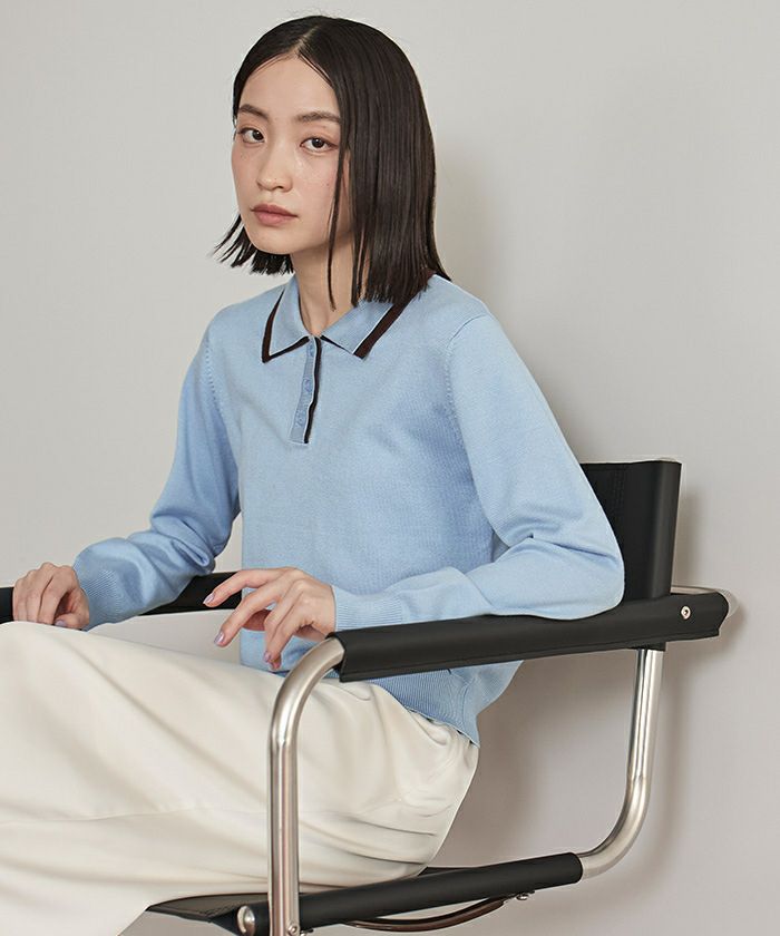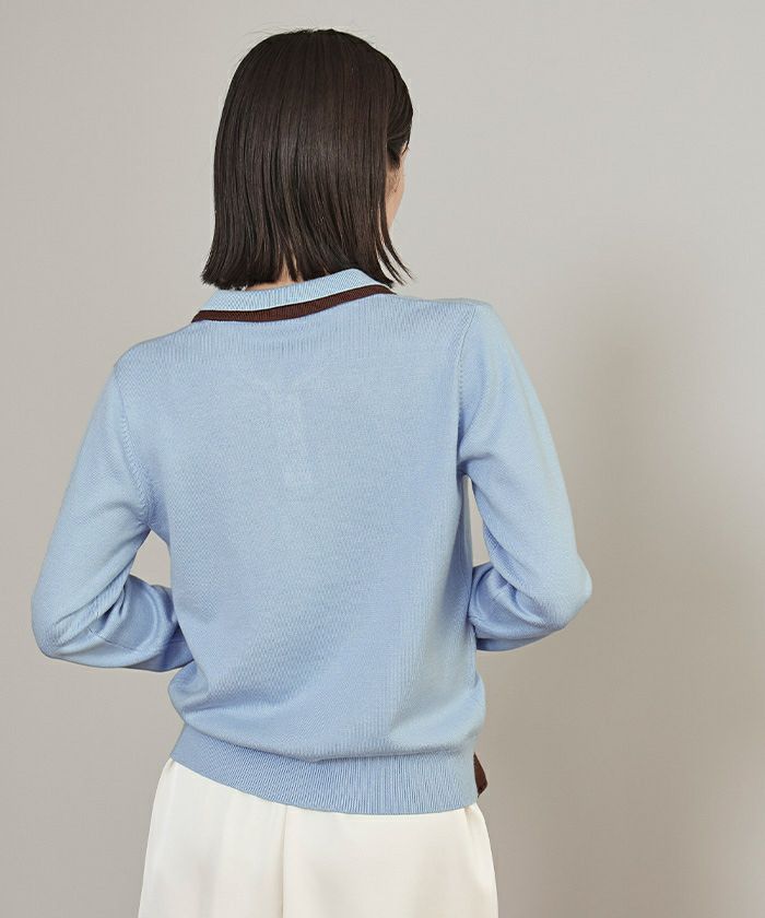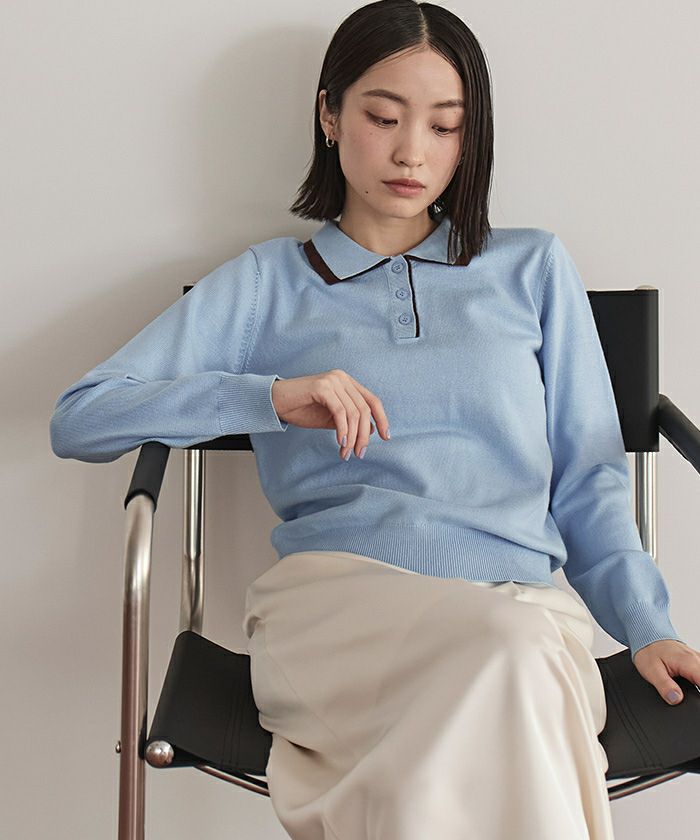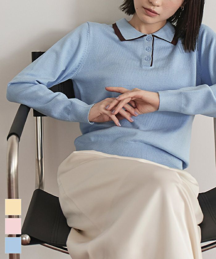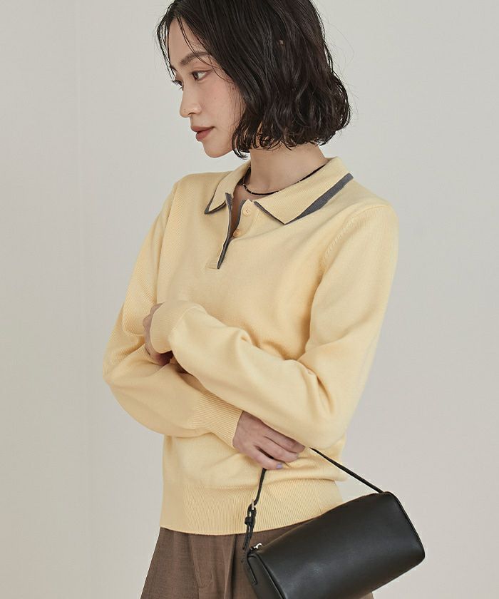 ・襟元と前立ての配色デザインのレイヤード風ニットトップス