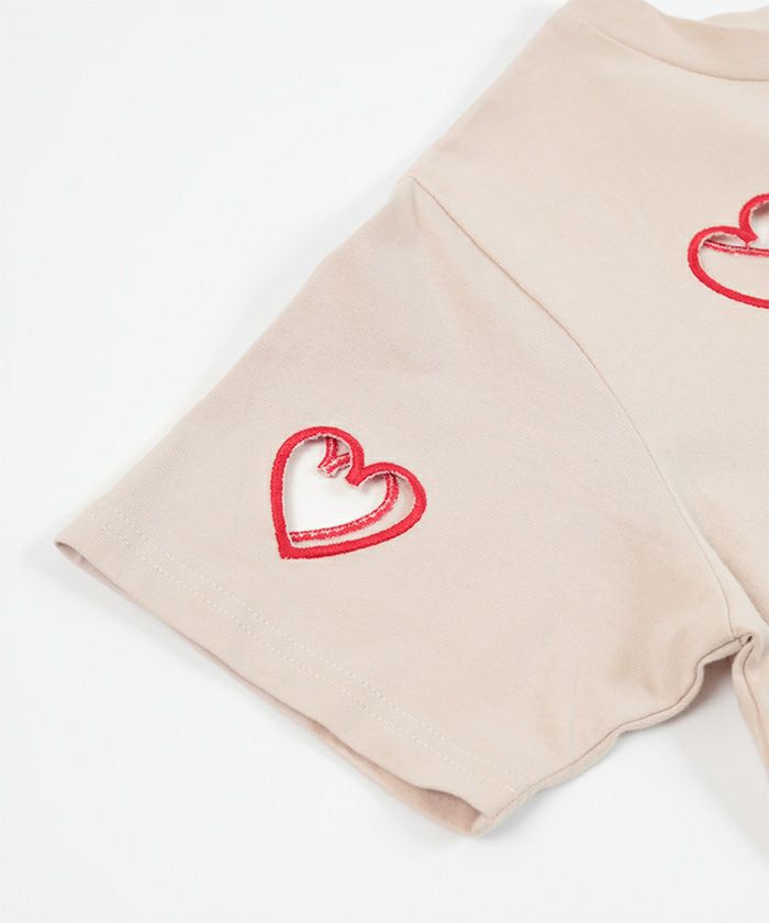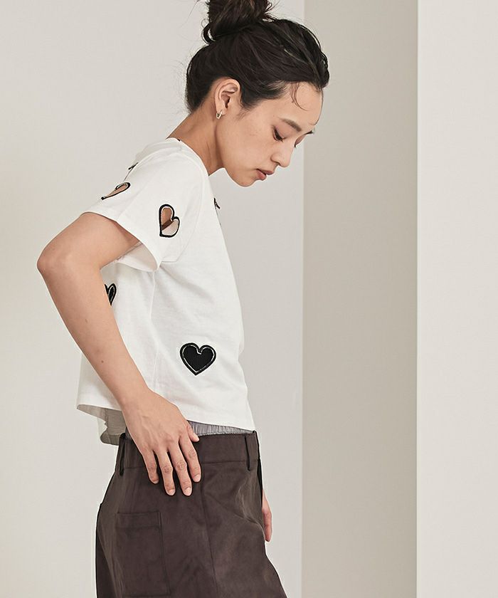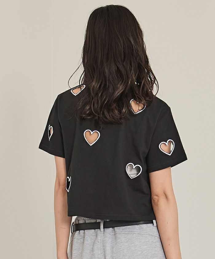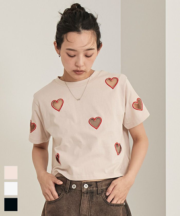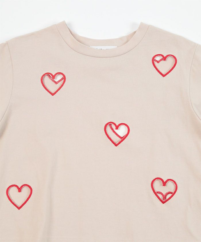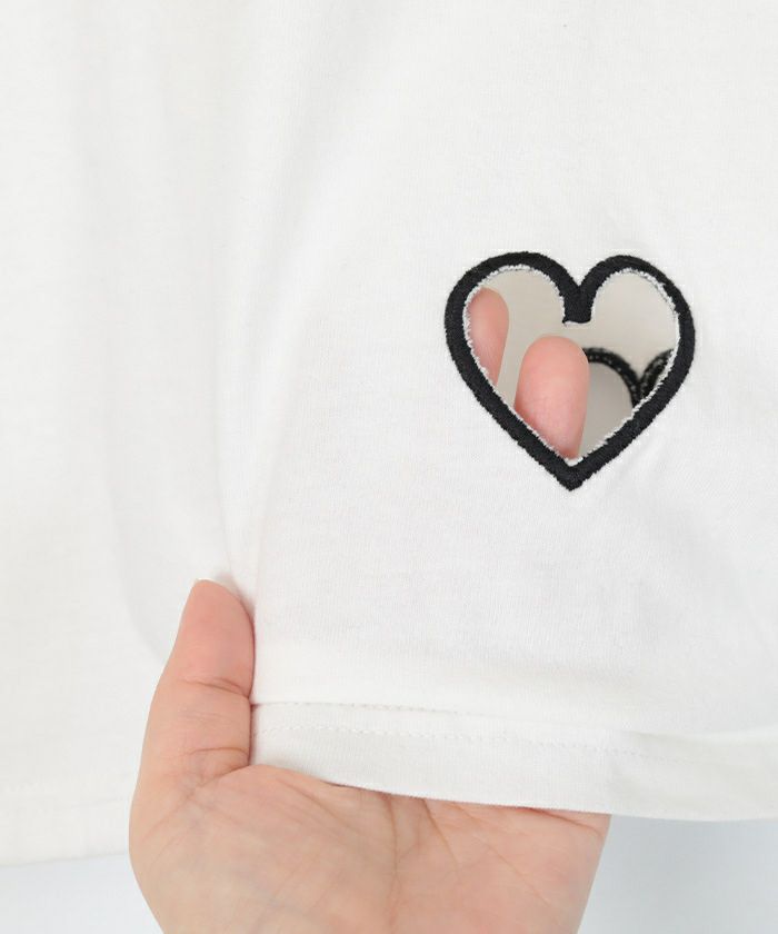・配色の刺繍でハートにくり抜かれたデザインのTシャツ。