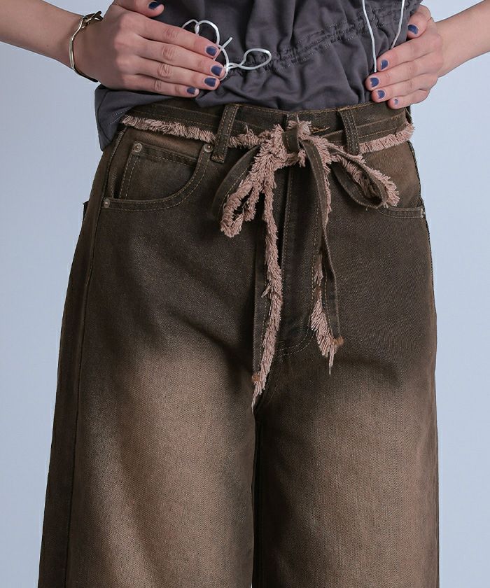 ・ウエストに共地のフリンジ紐付き。取り外し可能なのでスタイリングに合わせて変化させて楽しめます。