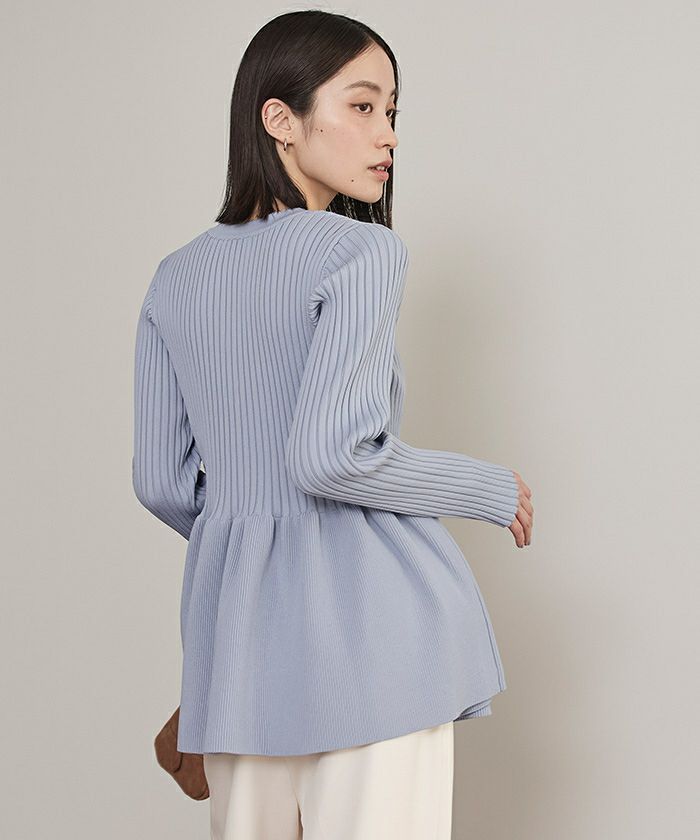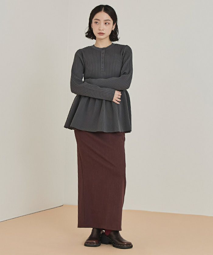 ・トレンドのヘンリーネックが引き立つ、ペプラムラインのリブニット
