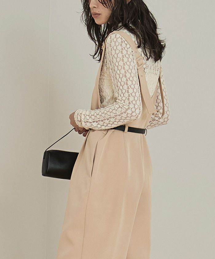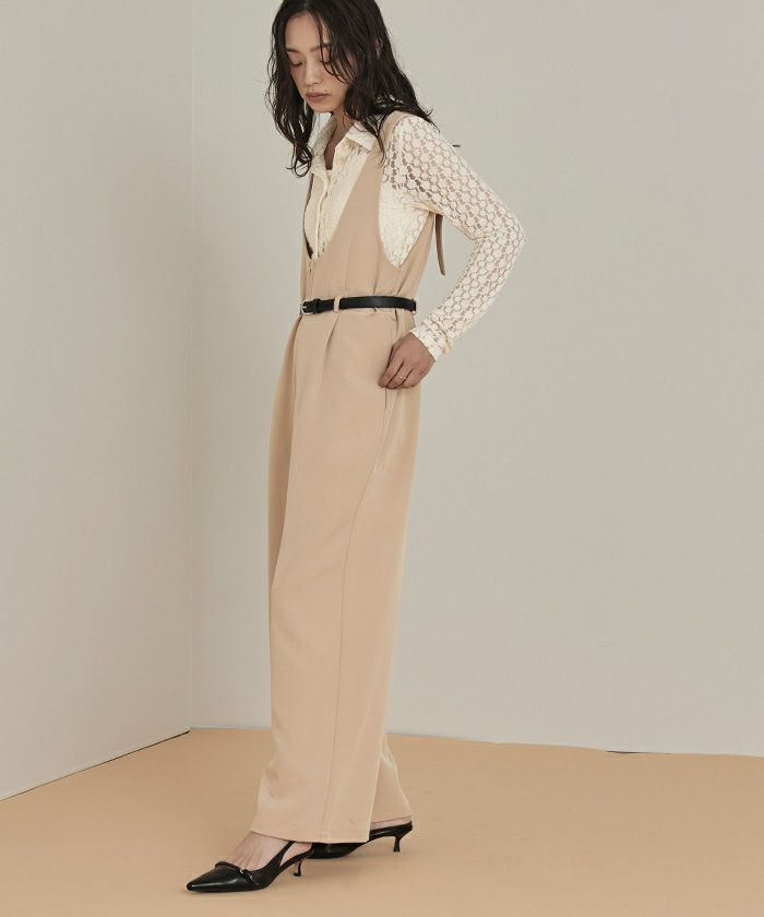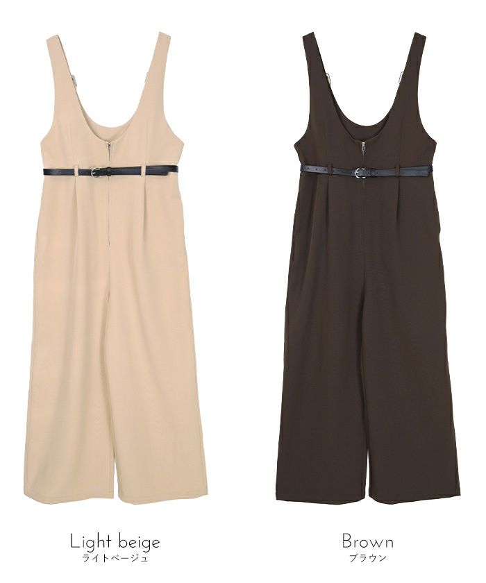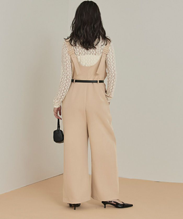 ・深めのUネックがポイントのベルト付きサロペットパンツ。