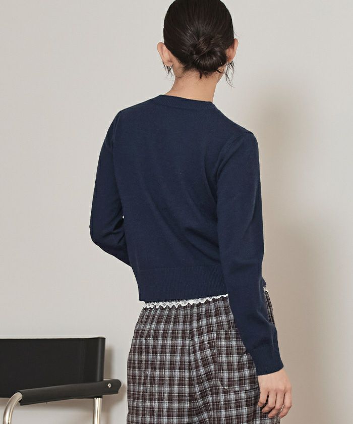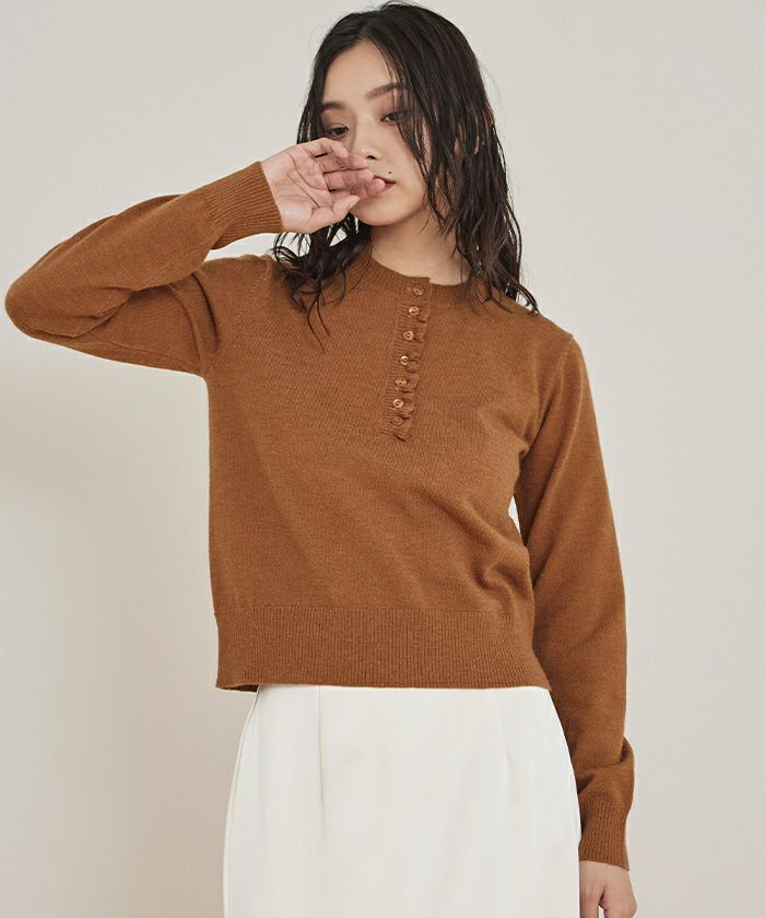 ・コンパクトなシルエットで前立てに細かなフリルをあしらった上品なヘンリーネックニット