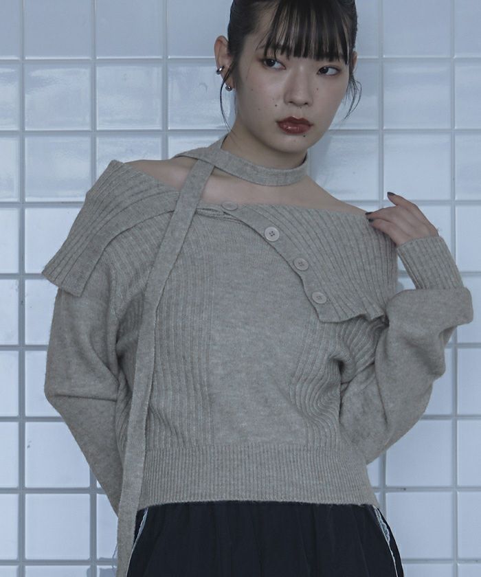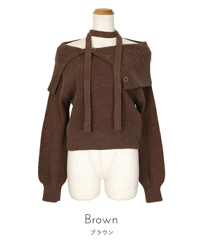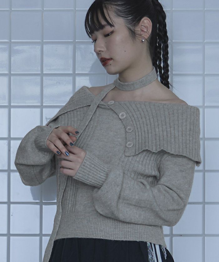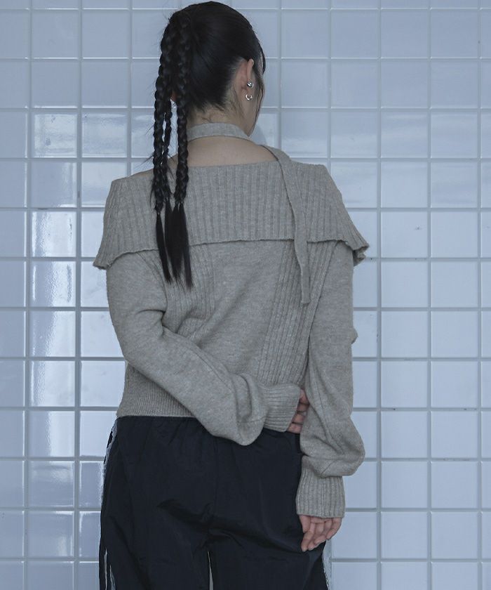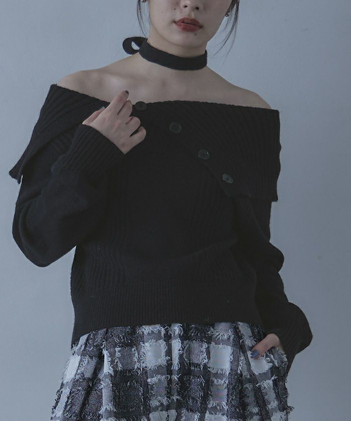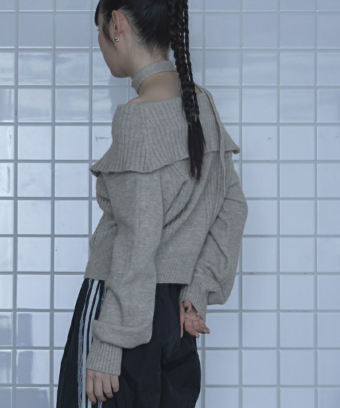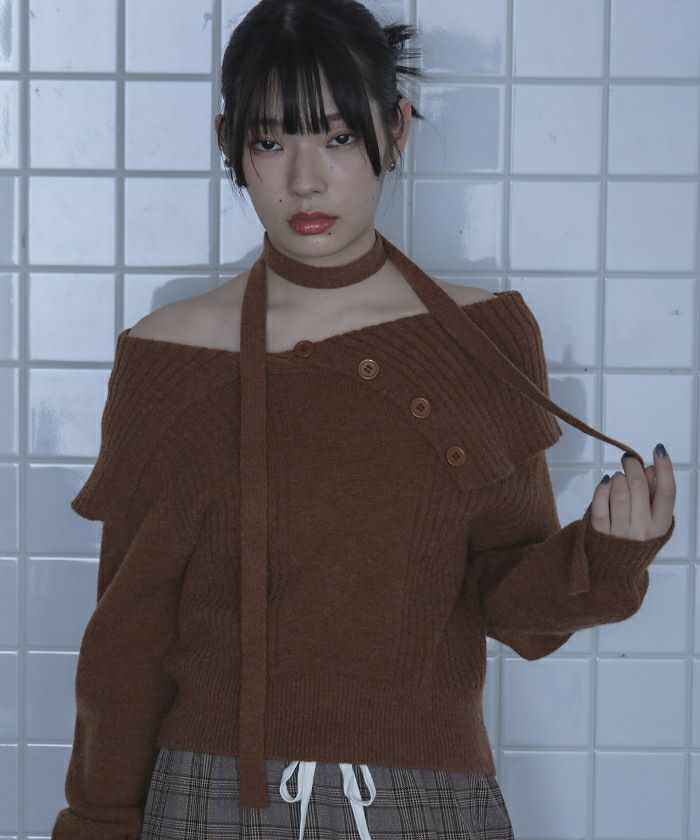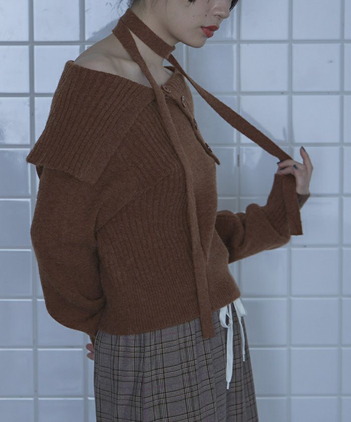 ・ロングタイ付きのオフショルニット