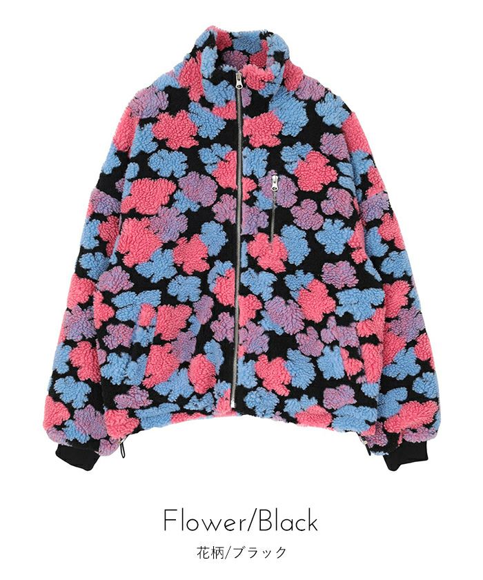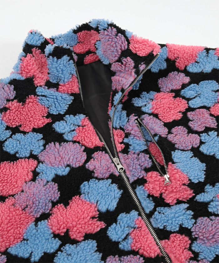 ・存在感のある総柄のボア素材を使用したブルゾン。