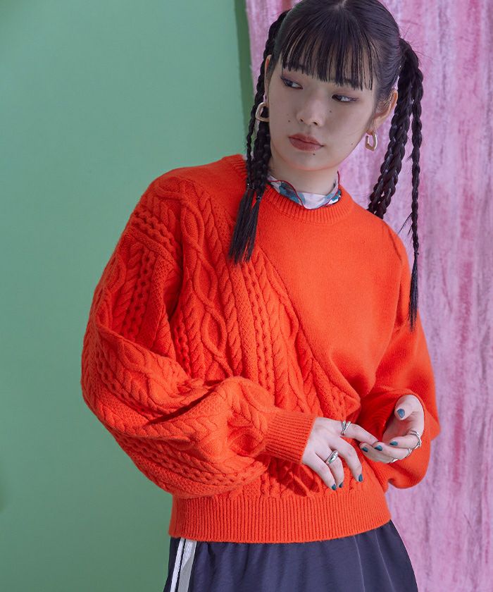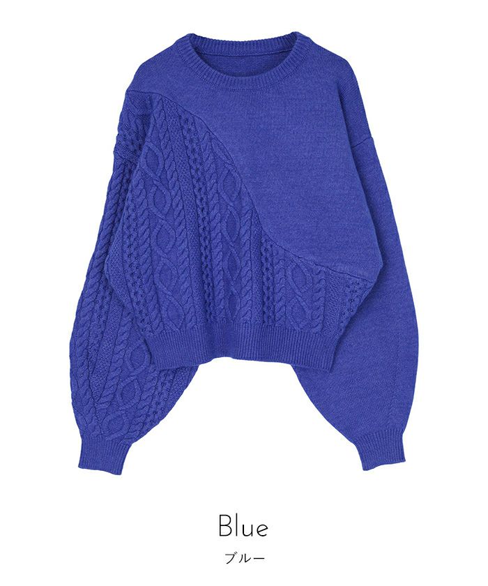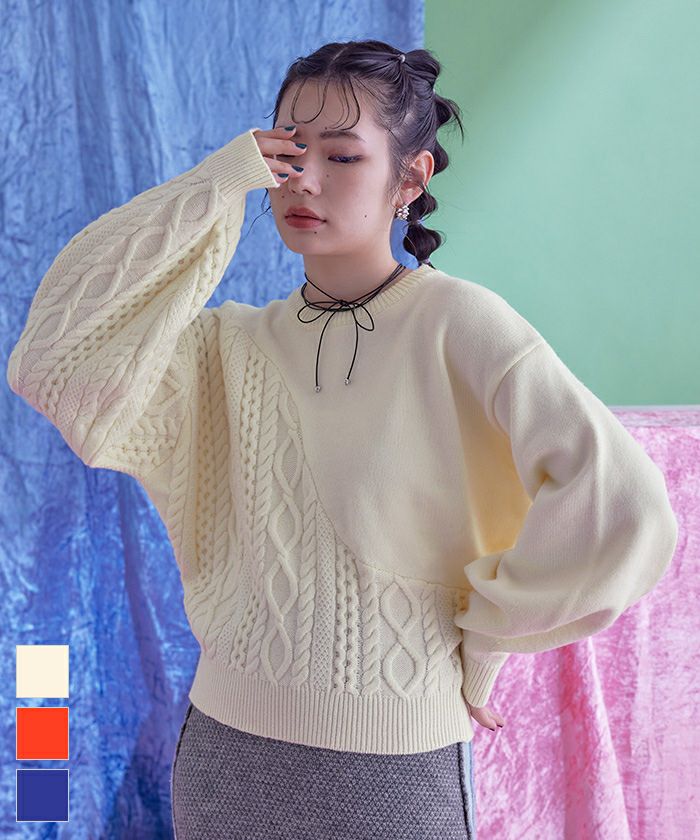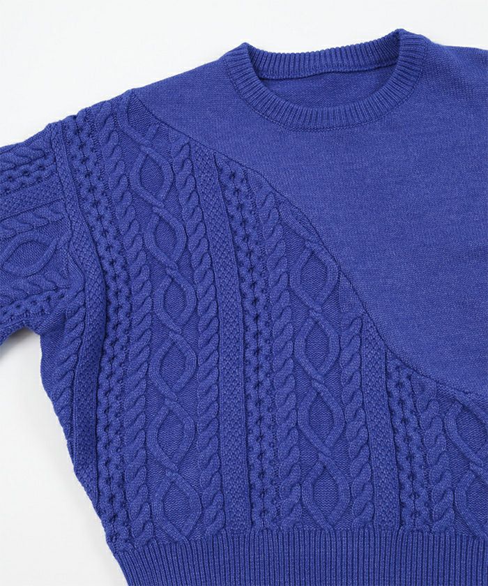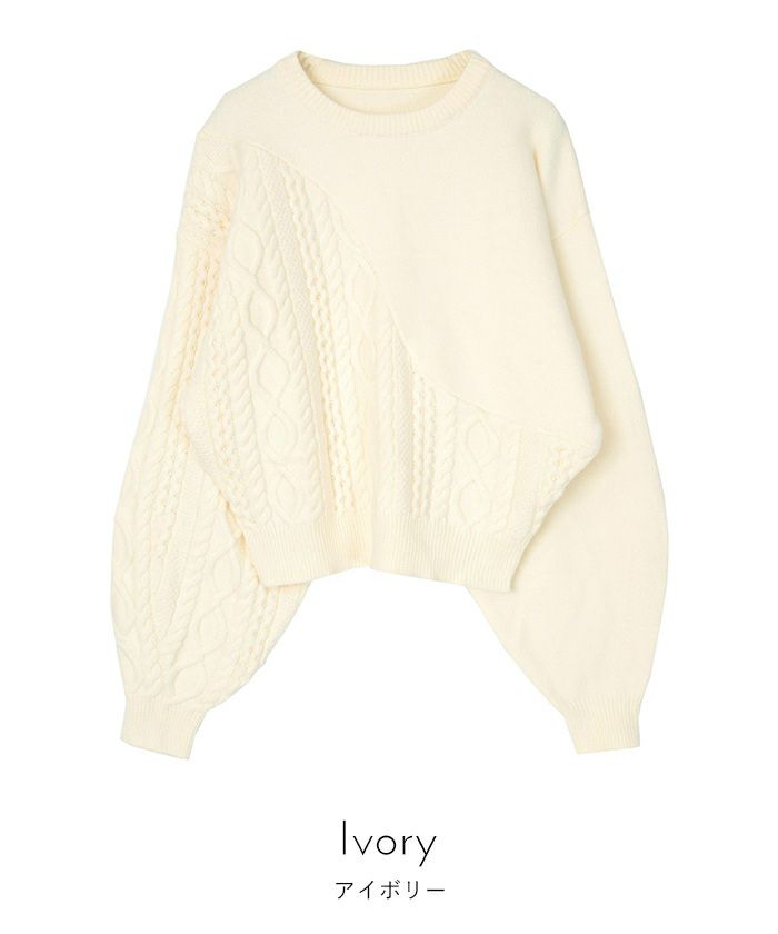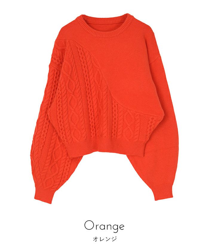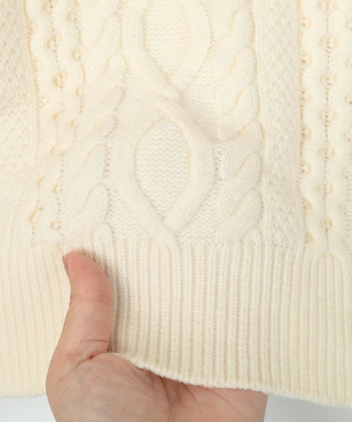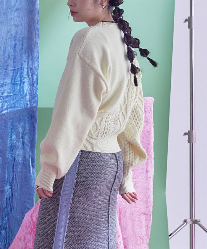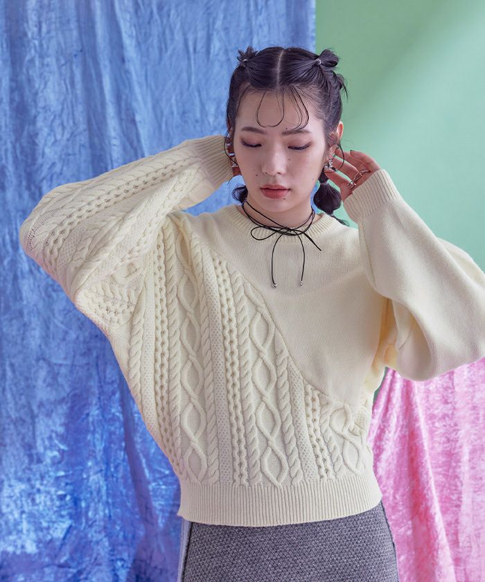 ・カーブの切替ラインがポイントのケーブルニットトップス。