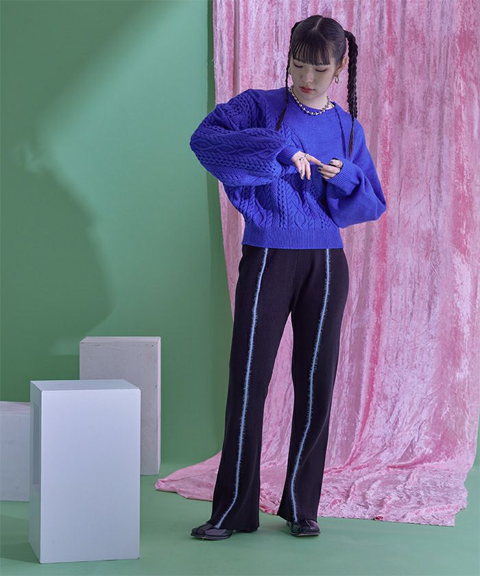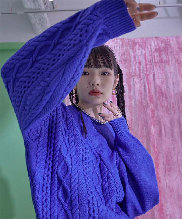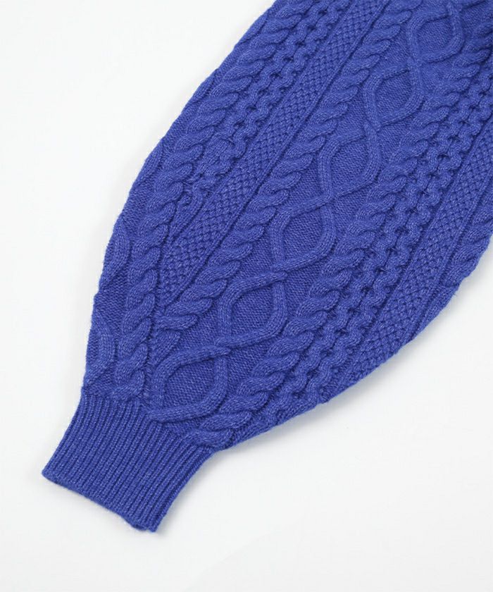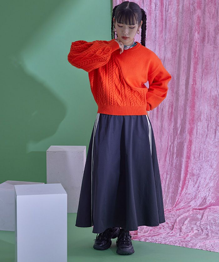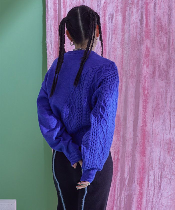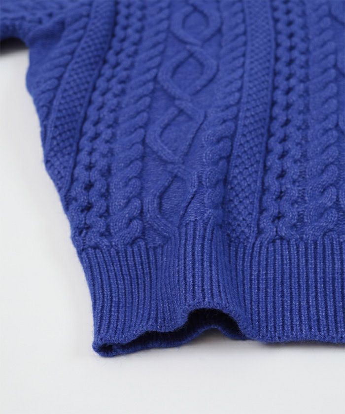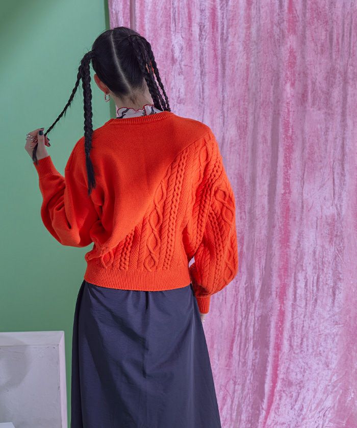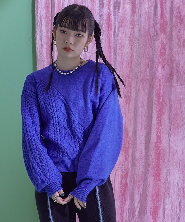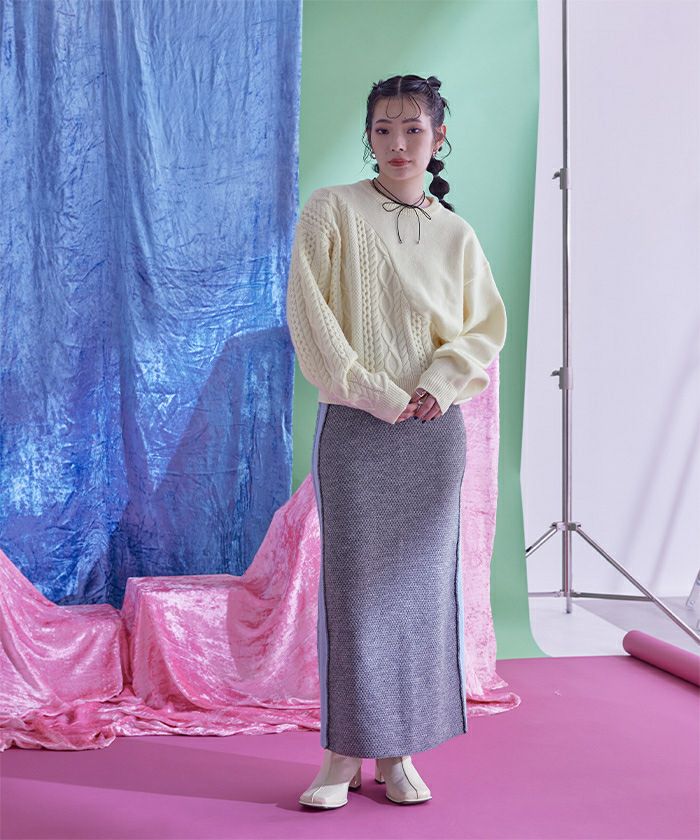 ・カーブの切替ラインがポイントのケーブルニットトップス。