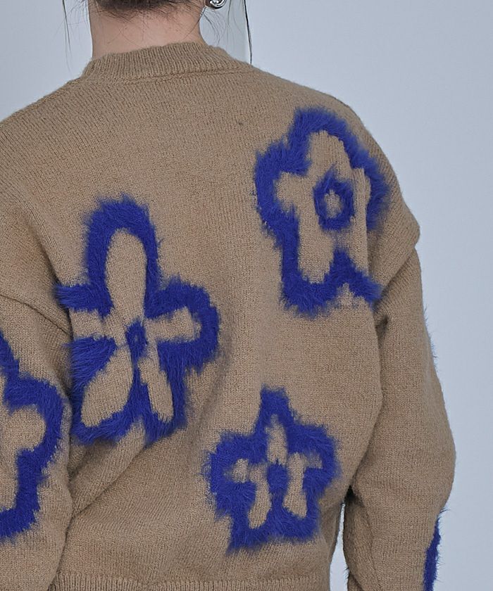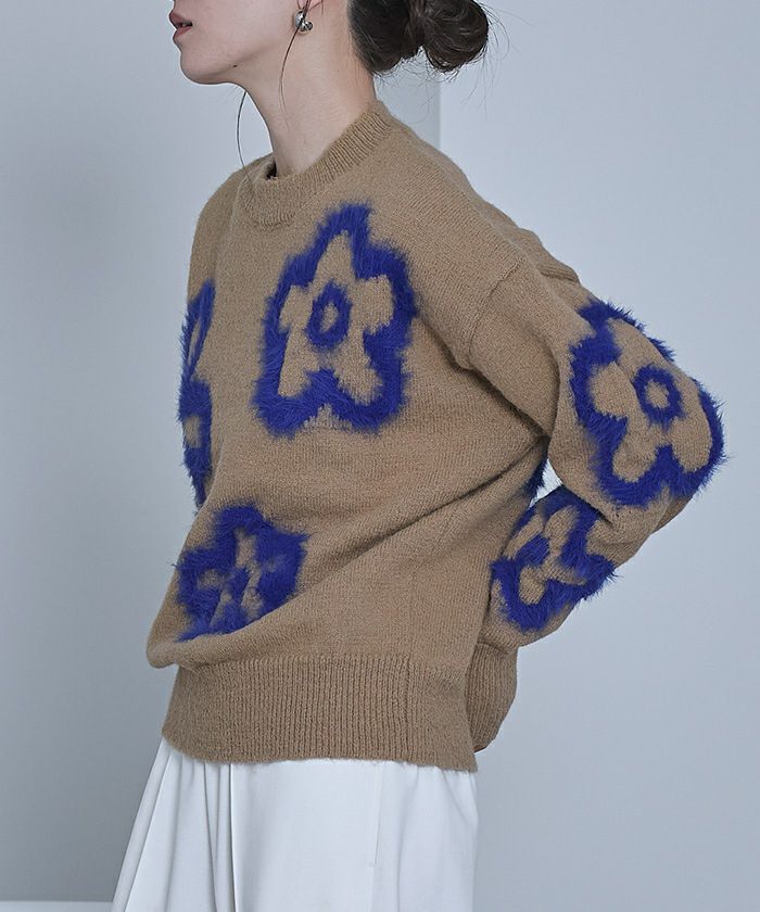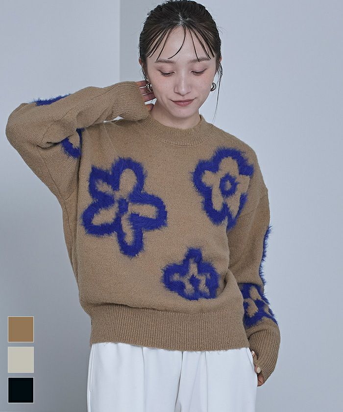 ・暖かみのあるシャギー素材のフラワー柄が可愛いニットトップス。