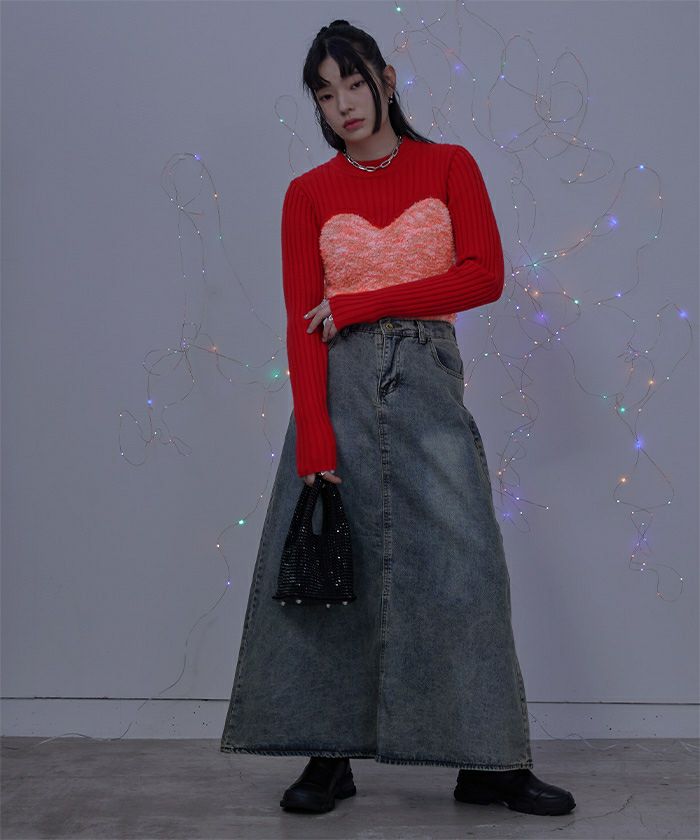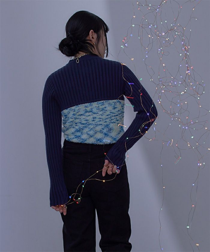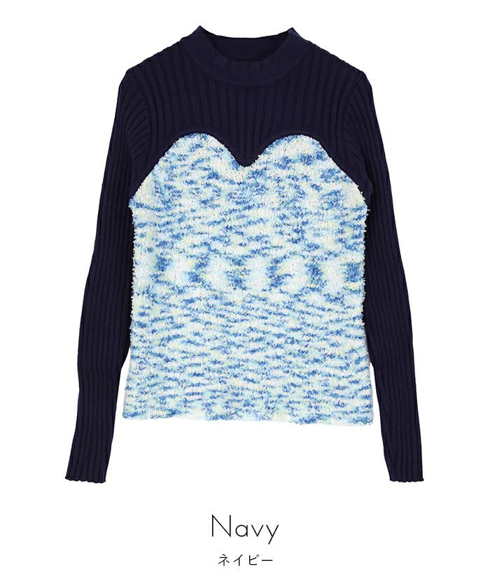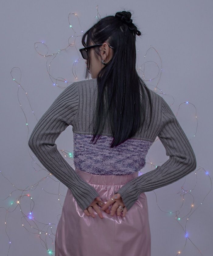 ・胸元のビスチェのような切り替えが印象的なニットトップス。