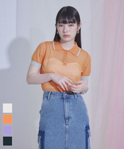 配色ラインシアー半袖ポロニット〔メール便可/50〕