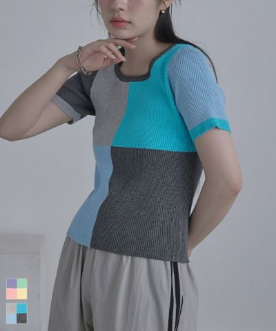 カラーパネル半袖リブトップス〔メール便可/80〕